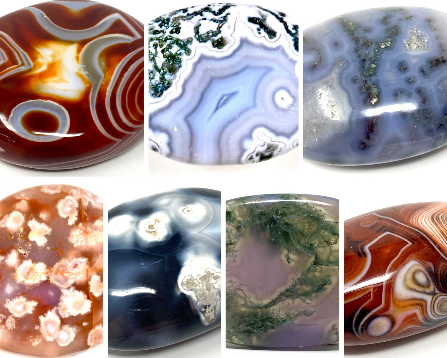 Explore a range of Agate Pebbles & Palm Stones, including Moss Agate/ Tree Agate, Cherry Blossom Agate/ Flower Agate, Orca Agate and more