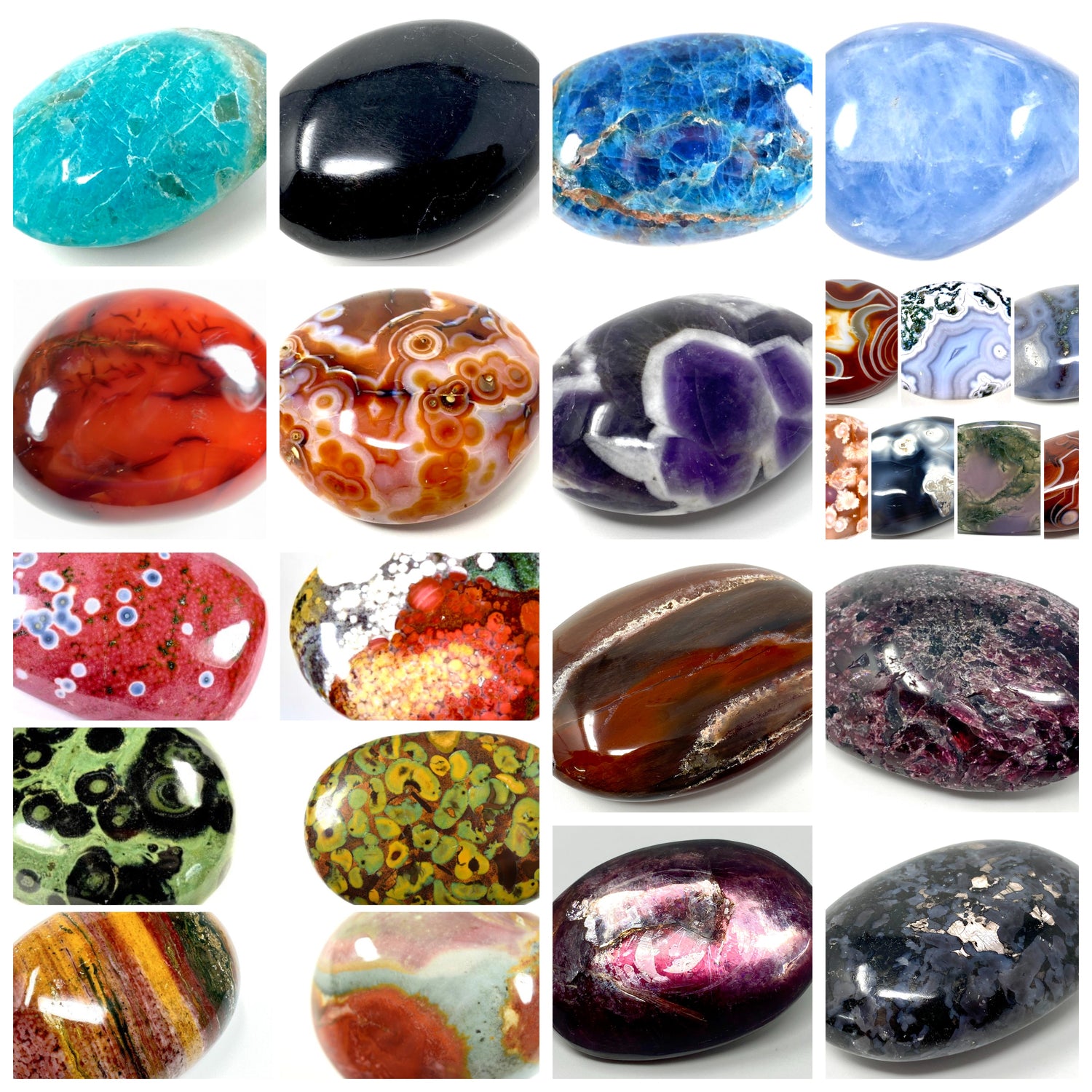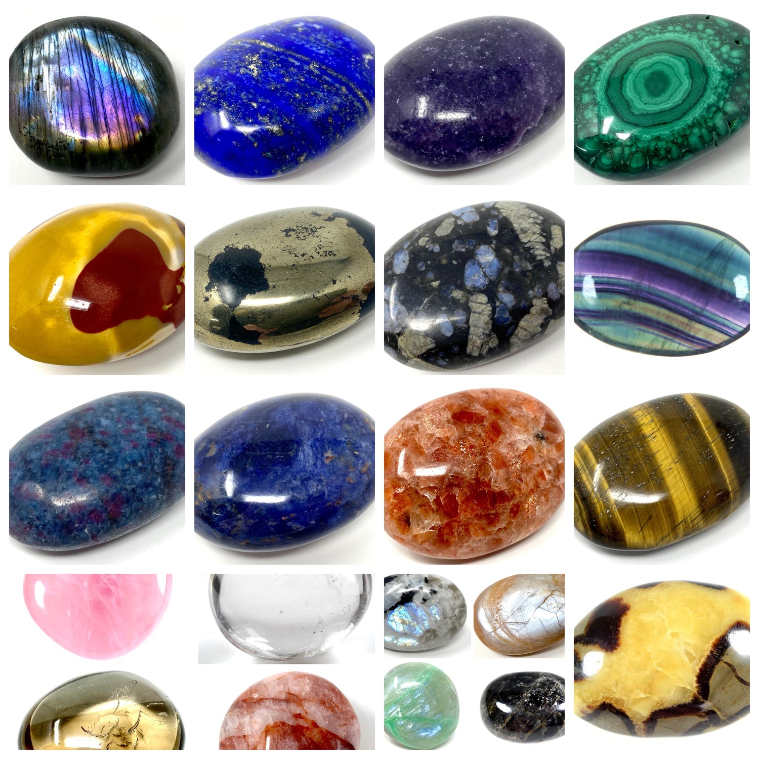 Explore our collections of crystal palm stones and pebbles by crystal type