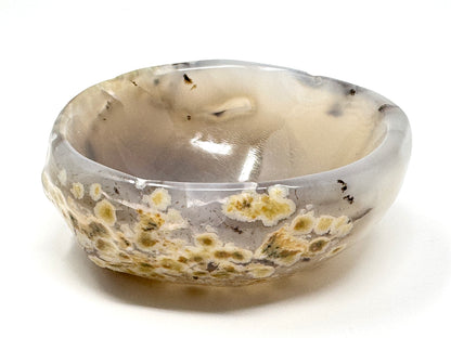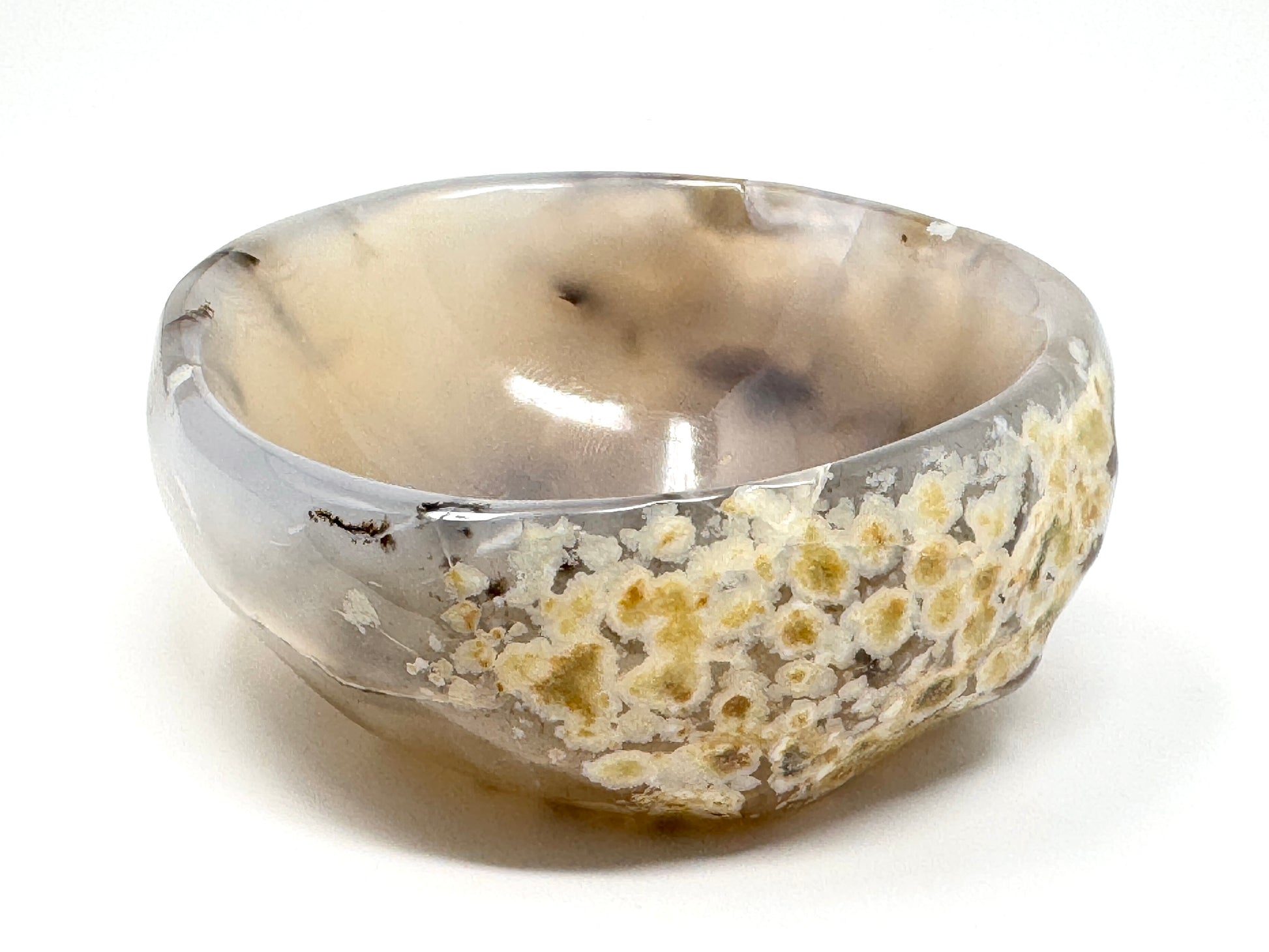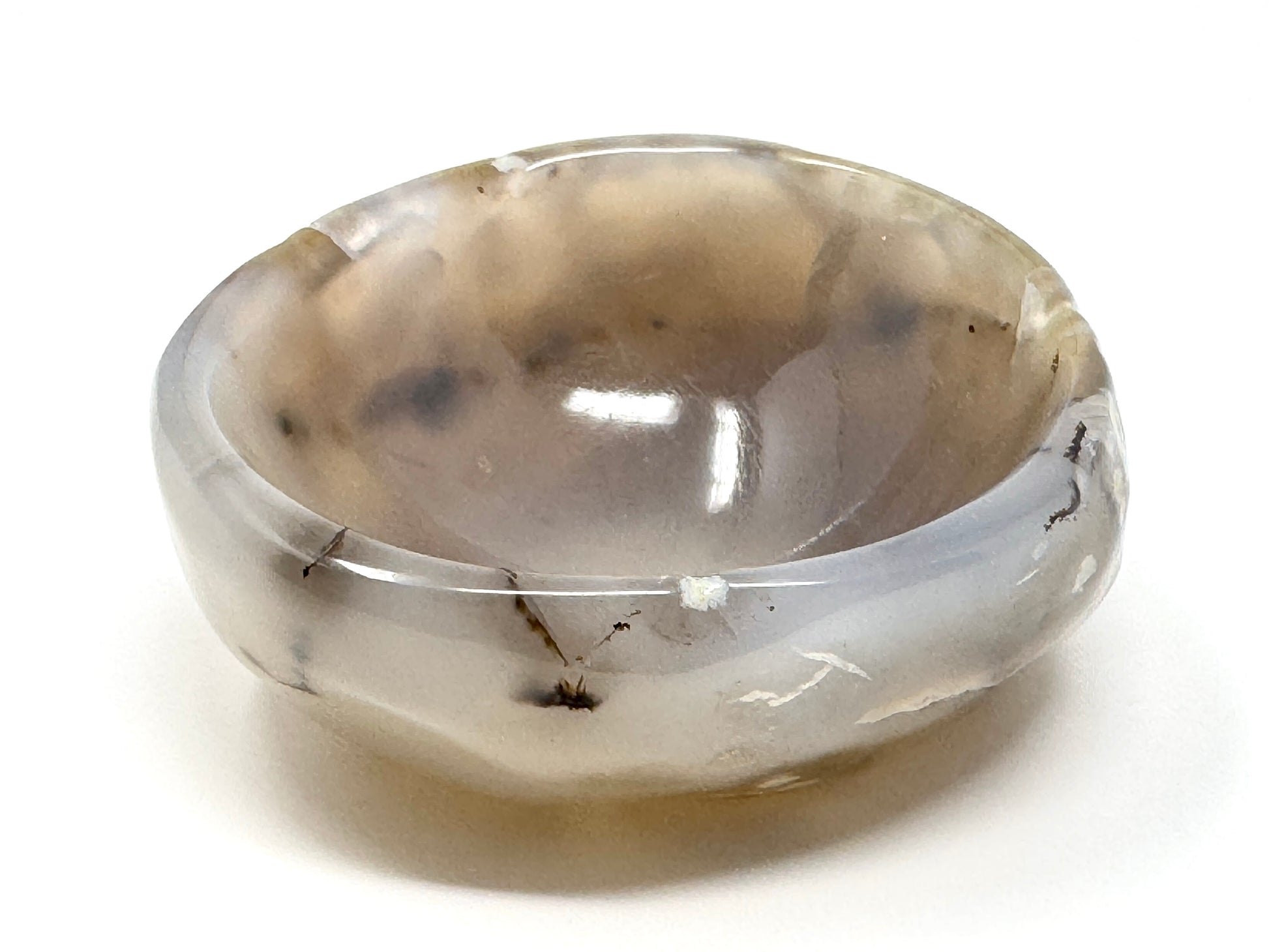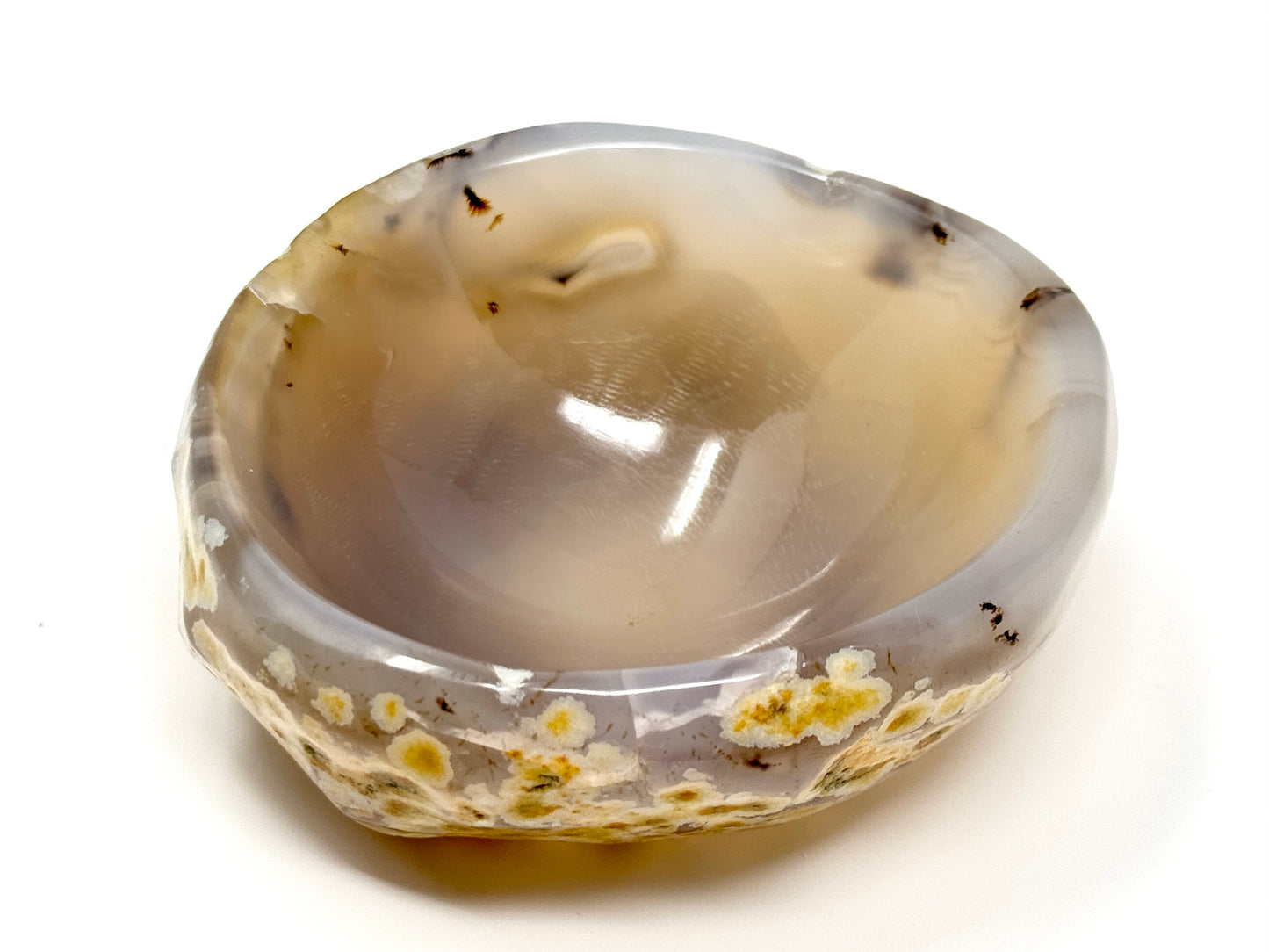 This dainty, beautiful Polished Agate Crystal Bowl demonstrates a smooth, glossy lustre, with some small natural pits on its otherwise smooth, polished surface.