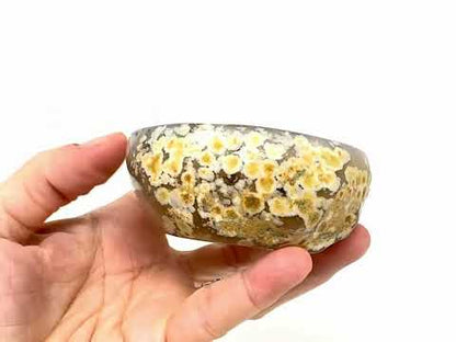 This gorgeous, dainty Agate Crystal Bowl measuring 9.1cm wide has been carefully cut and polished into a round crystal bowl shape from natural Agate Stone, and displays mesmerising beige-brown, orange, and blue-grey agate patterns.