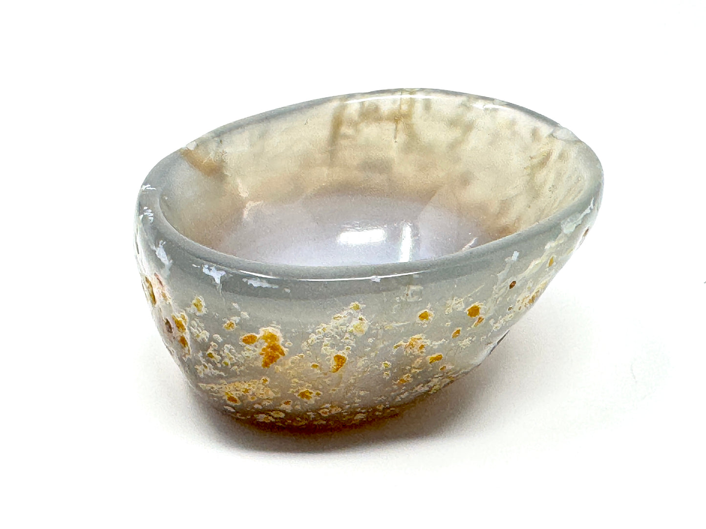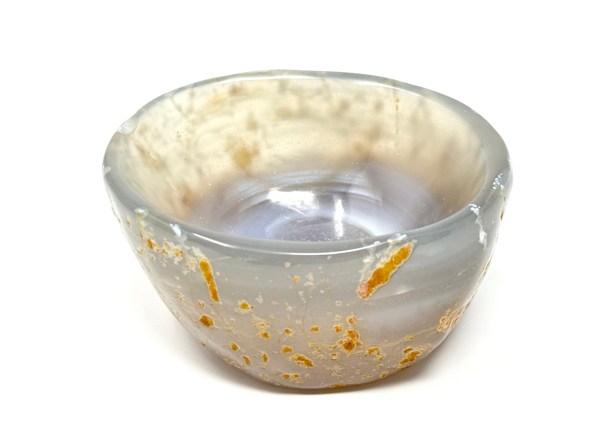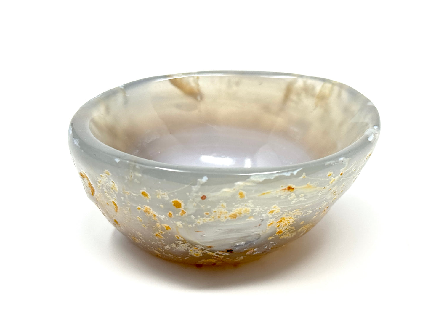 This gorgeous, dainty Agate Crystal Bowl measuring 8.9cm wide has been carefully cut and polished into a round crystal bowl shape from natural Agate Stone, and displays mesmerising translucent beige-brown, grey, and blue-grey agate patterns.