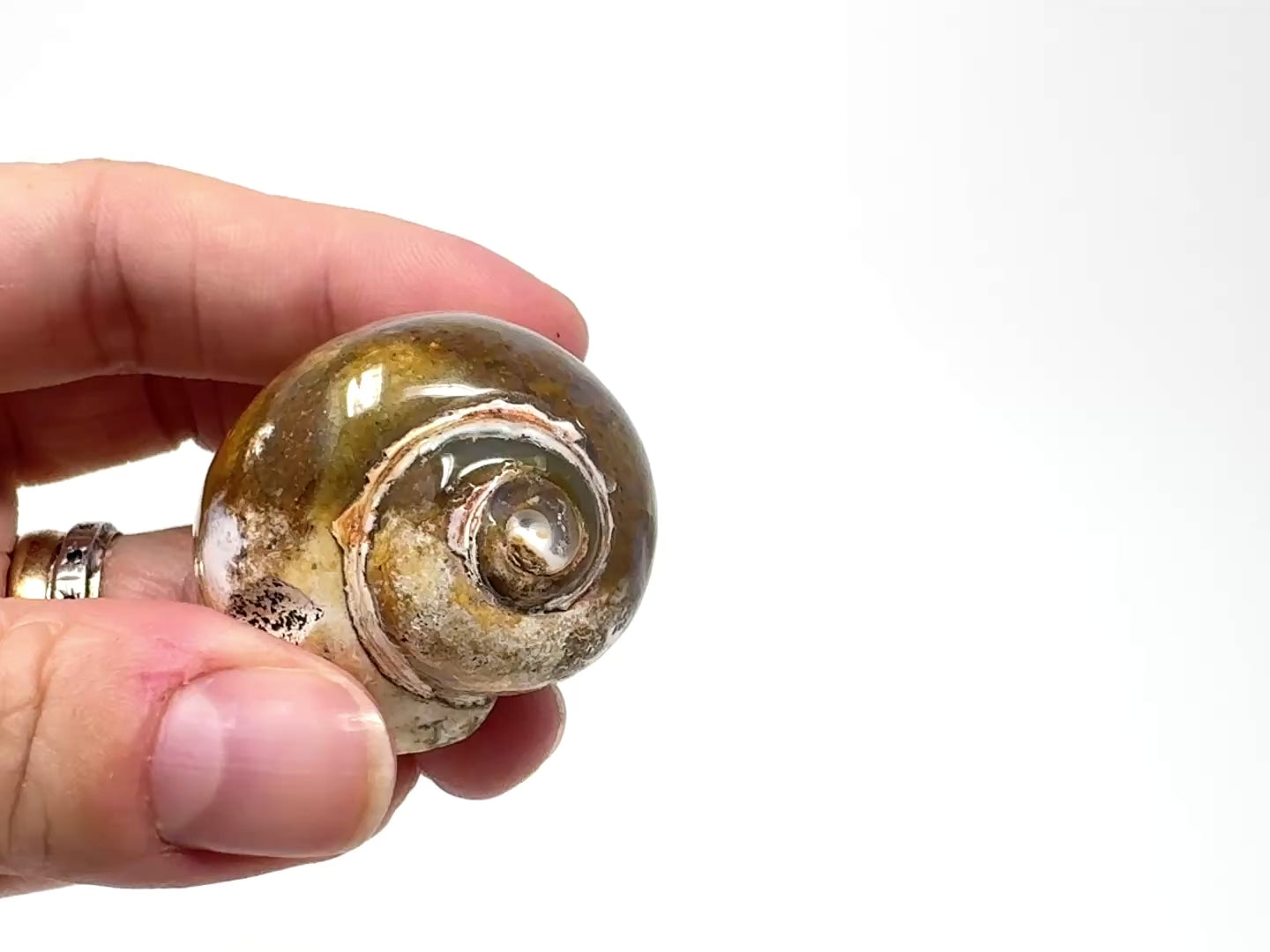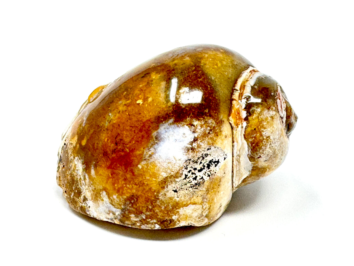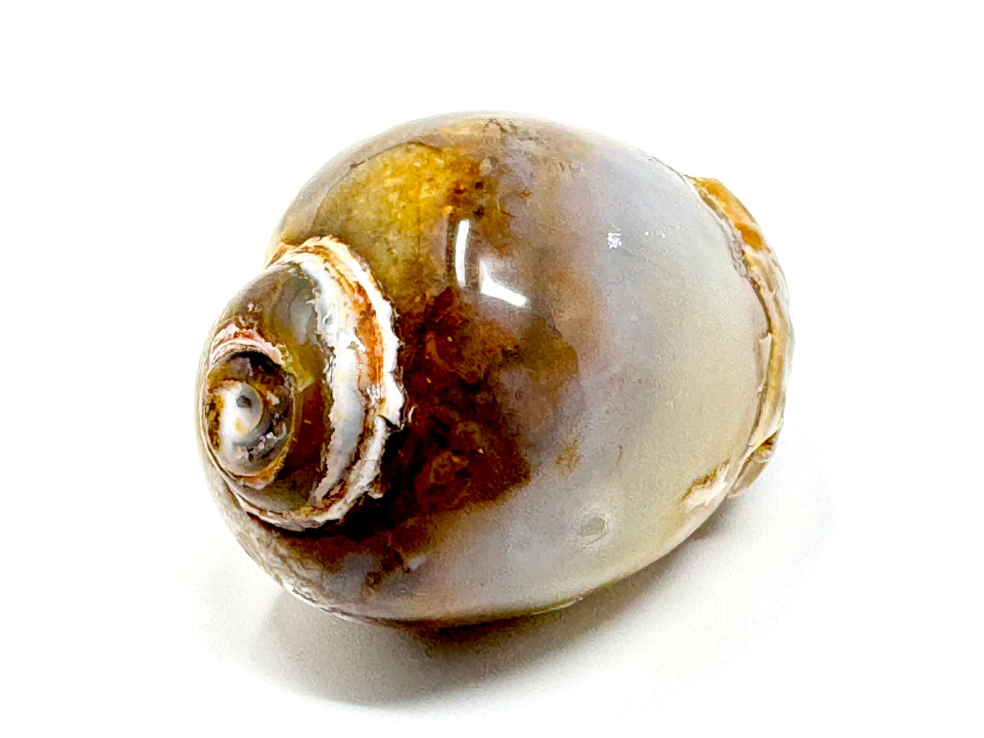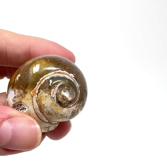 The colours and sleek, smooth polish of the Chalcedony Replaced Gastropod Fossil Shell are mesmerising.