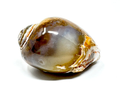 This Agatized Gastropod Fossil (or Silicified Gastropod Fossil) displays a beautiful Agatized Fossil Shell formed from colourful Chalcedony Replacements in rich white, orange, and brown hues.