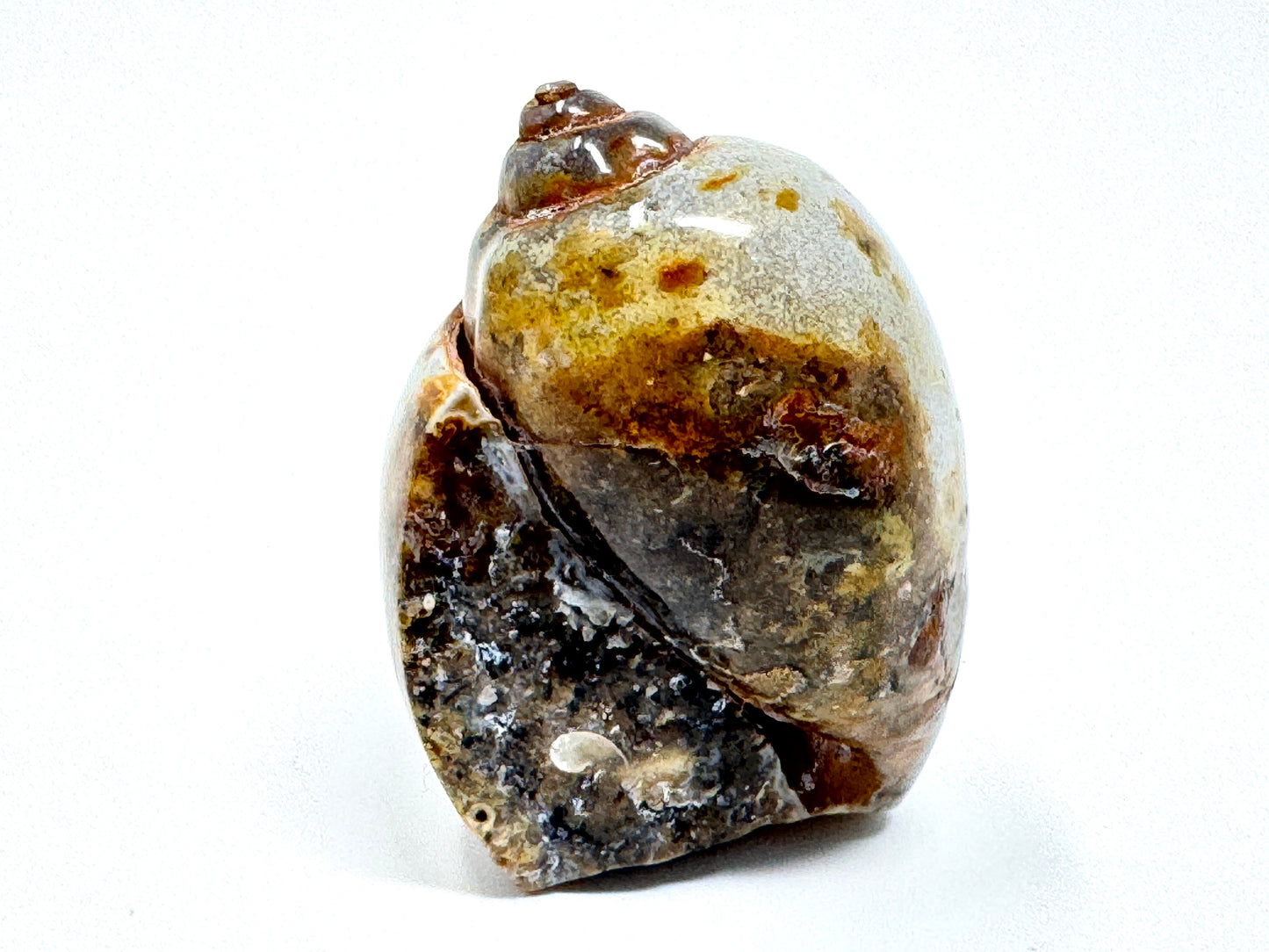 The colours and sleek, smooth polish of the Chalcedony Replaced Gastropod Fossil Shell are mesmerising.
