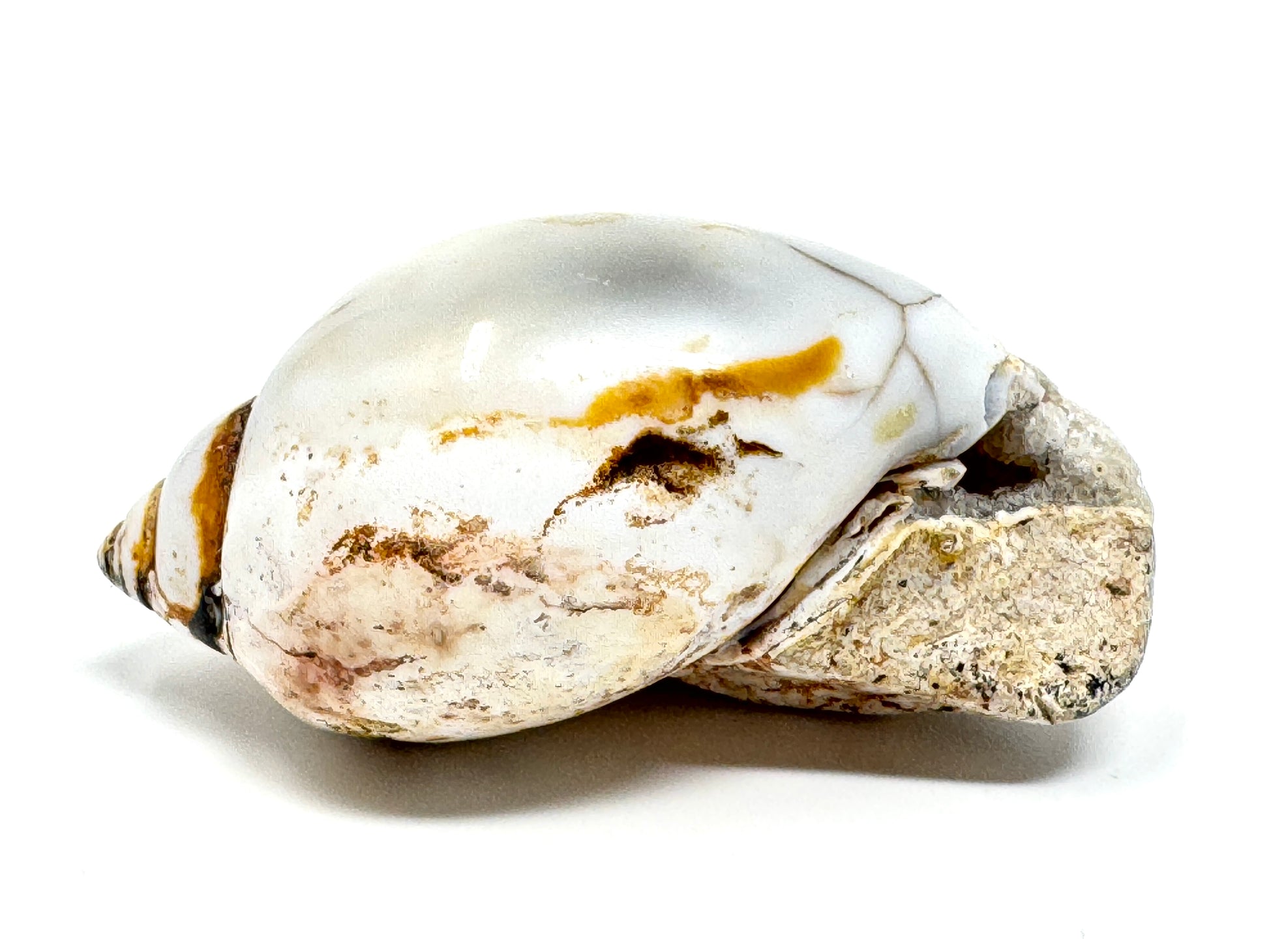 This Agatized Gastropod Fossil (or Silicified Gastropod Fossil) displays a beautiful Agatized Fossil Shell formed from colourful Chalcedony Replacements in rich white, orange, and brown hues.