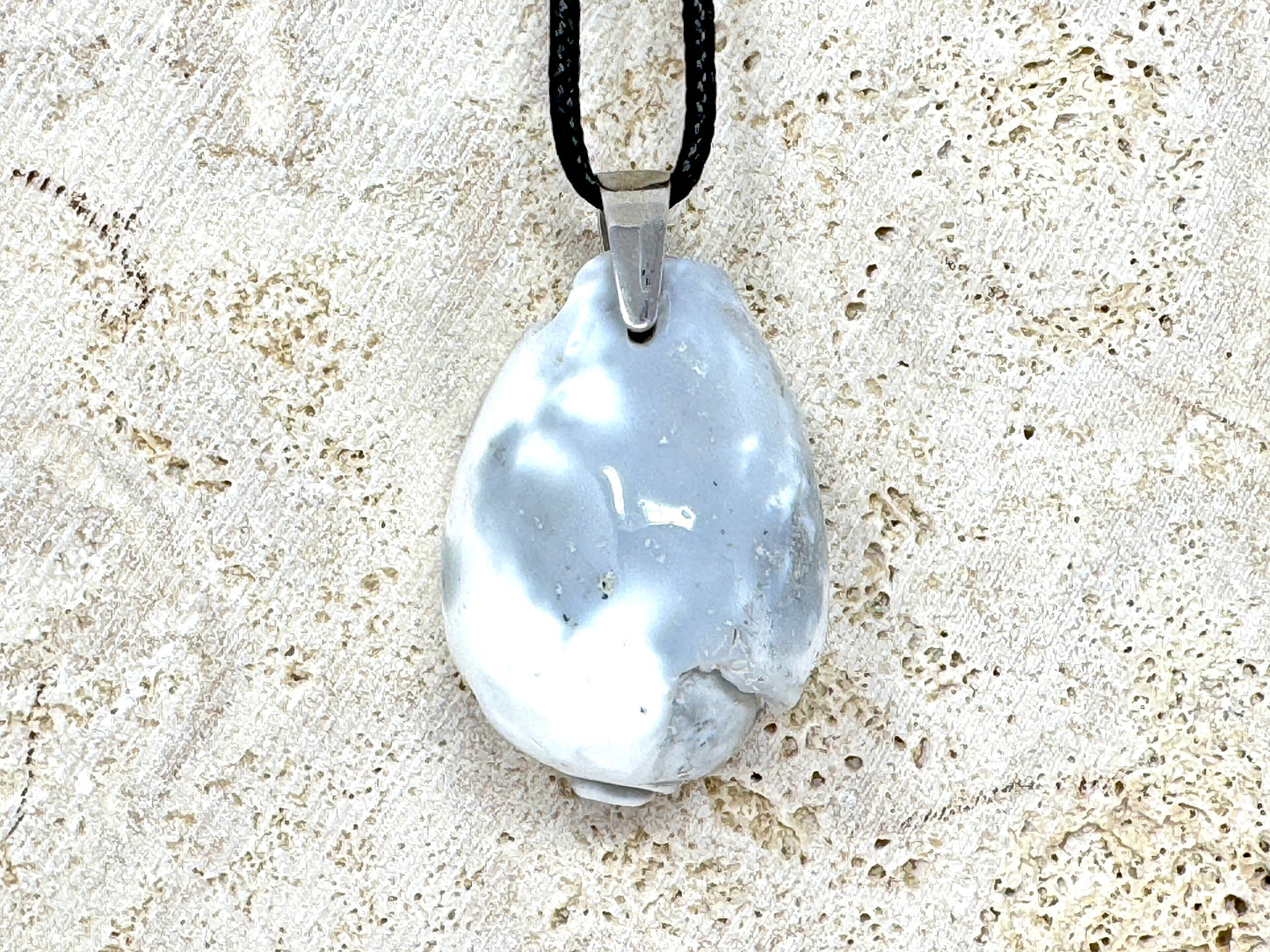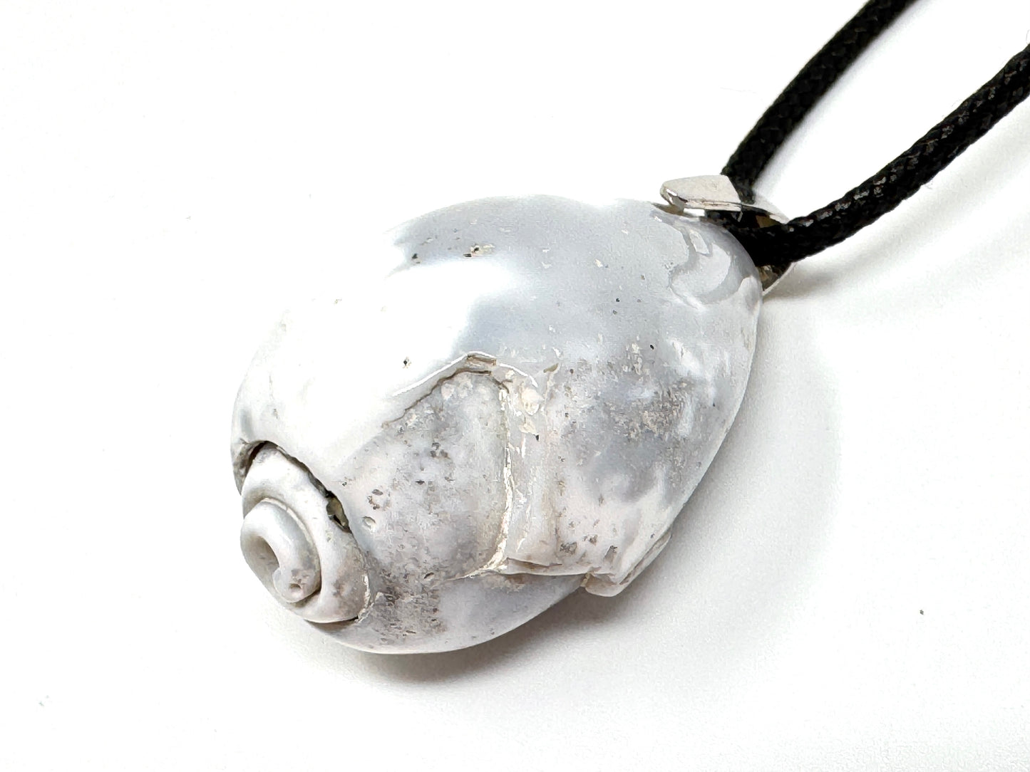 The Agatized Gastropod Fossil Pendant has been drilled and set with a Tarnish-Resistant Rhodium-Plated Stamped 925 Silver Bail, making it perfect for attaching to a chain to make a Fossil Necklace and other types of Fossil Jewellery.