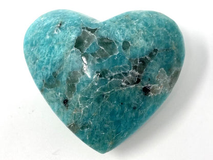 This gorgeous Amazonite Crystal Heart measures 4.6cm wide and displays vivid turquoise blue-green hues with some areas of grey Smoky Quartz.