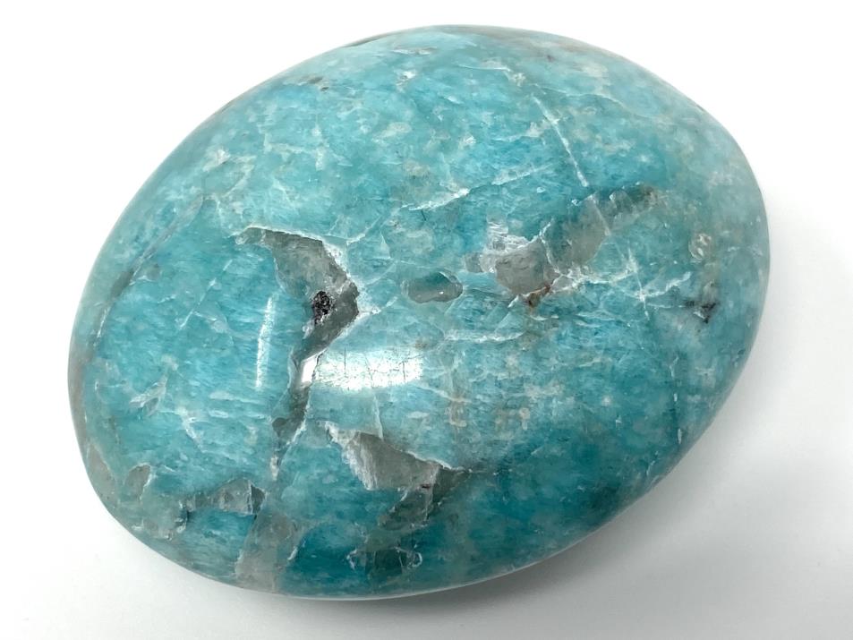 This gorgeous Amazonite Crystal Pebble (also known as an Amazonite Crystal Palm Stone) measures 5.7cm long and displays vivid turquoise blue-green hues with some areas of grey Smoky Quartz.
