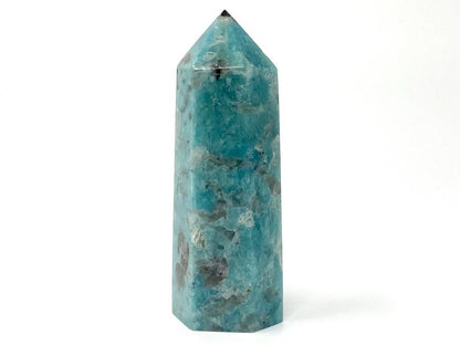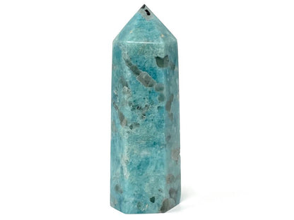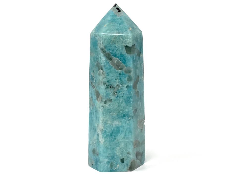 This Amazonite Crystal (otherwise known as Amazon Stone) has been carefully cut and polished into a smooth Free-Standing Crystal Point with a stable free-standing base, multiple polished faces/sides, and a pointed tip.