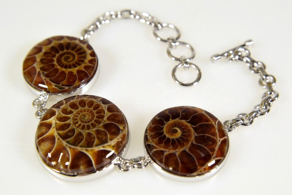 Dimensions: Bracelet Length: 21cm. Central Ammonite: 2.5cm diameter. Other Ammonites: 2.25cm diameter.