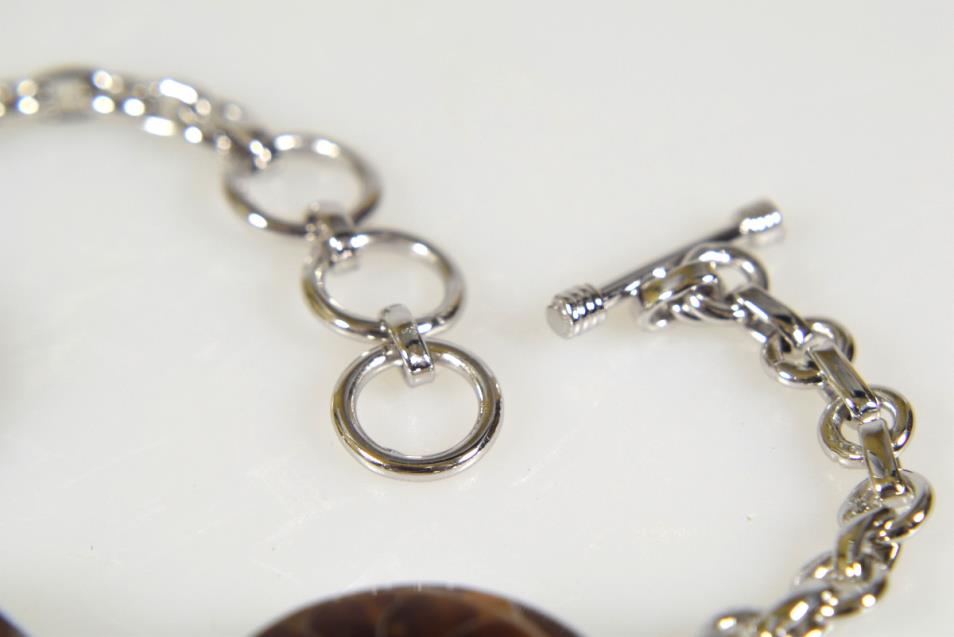 Ammonite cabochon Bracelet bevel set in 925 Rhodium plated silver. This lovely cut and polished ammonite bracelet is bevel set in 925 Rhodium plated silver it is beautifully hand crafted using the highest grade Madagascan ammonites from the cretaceous period, 120 million years old found in Mahajanga. This bracelet displays the ammonites richly coloured calcite chambers and the silver is Rhodium plated that prevents tarnishing. This bracelet can be worn at 18cm, 19cm or 20cm long.