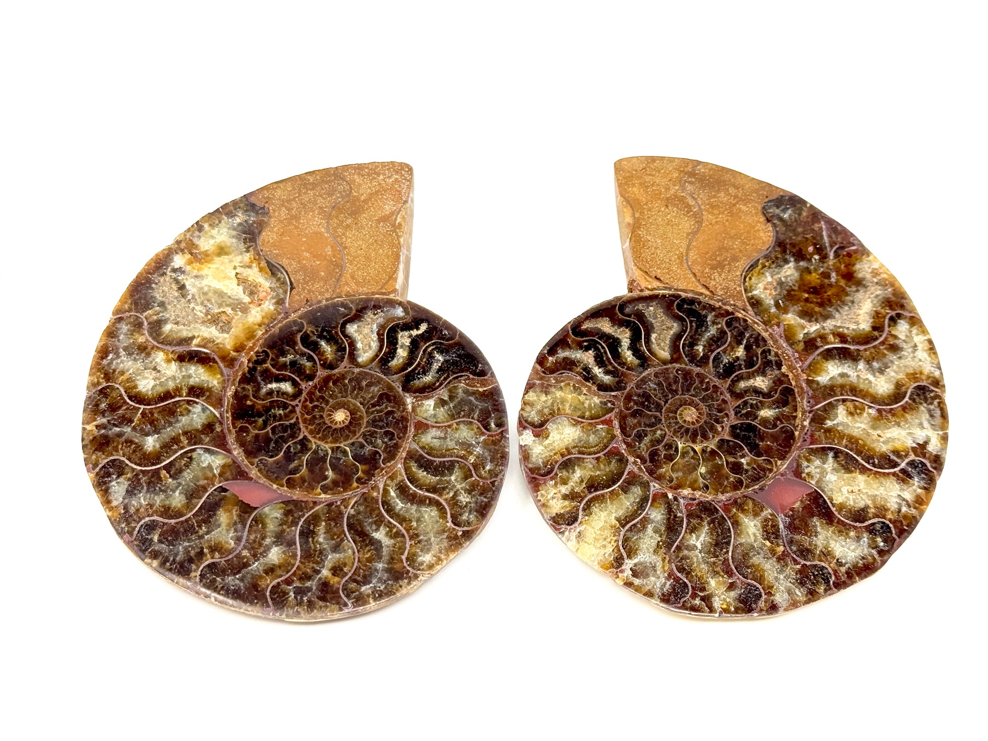 This fossil consists of an Ammonite cut and polished to create a striking pair. Both of the pieces display highly polished surfaces and a natural shell. The fossil pattern reveals gorgeous, colourful internal calcite chambers.