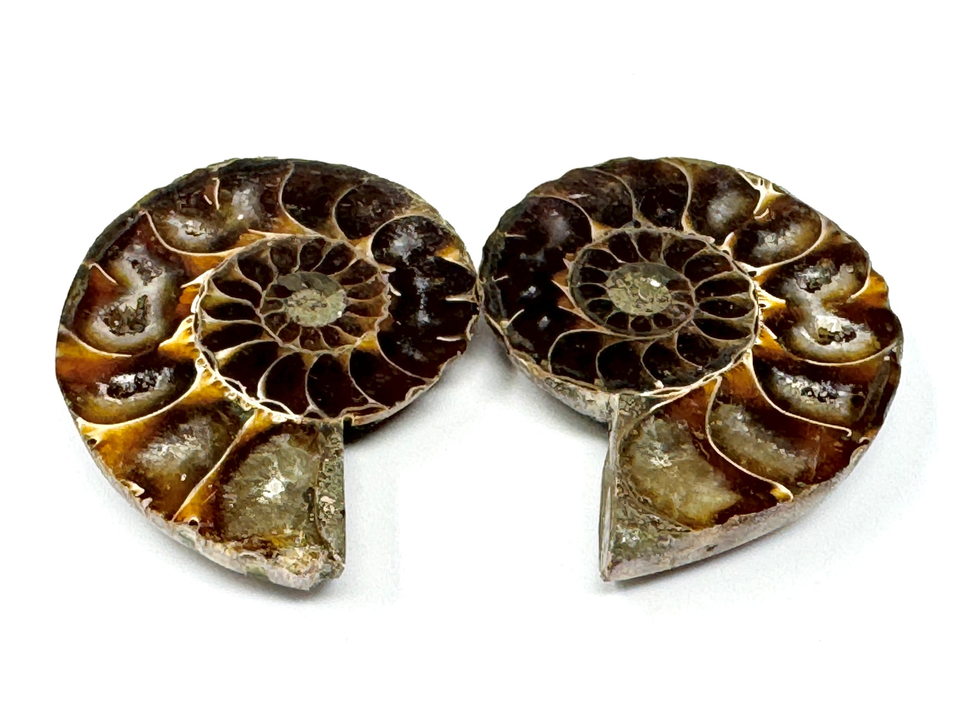 This particular Ammonite pair, of the Desmoceras species, measures 5.6cm wide. These wonderful brown fossils display intricate swirling patterns and deep caramel, chocolate-brown, and cream tones upon their highly polished surfaces.