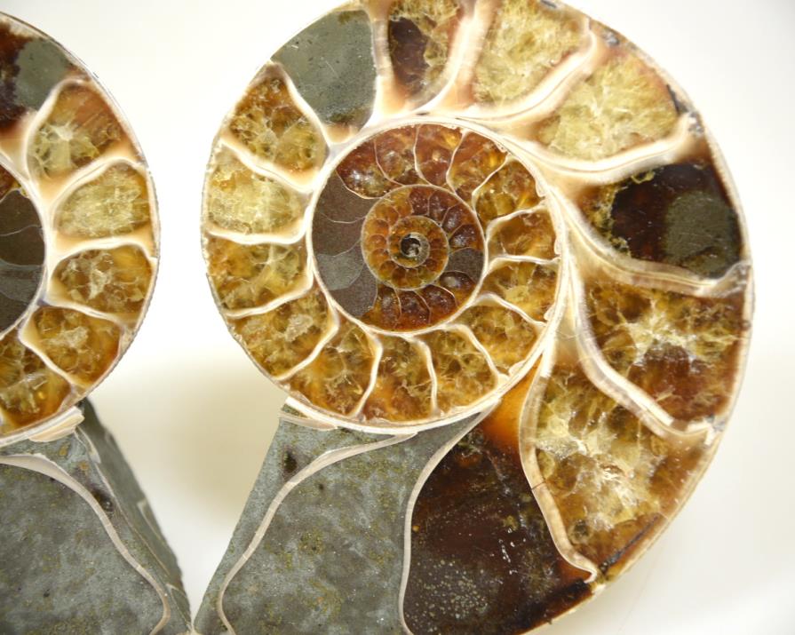 Ammonite Pair, fossil for sale from Madagascar. This high-grade Ammonite Pair is 8.7cm at its widest measurement, and consists of an Ammonite cut and polished to create a striking pair. Both of the pieces display a rough natural surface on one side, and a highly polished surface on the other, which reveals deep caramel, chocolate-brown and yellow tones and gorgeous cream-coloured internal calcite chambers.