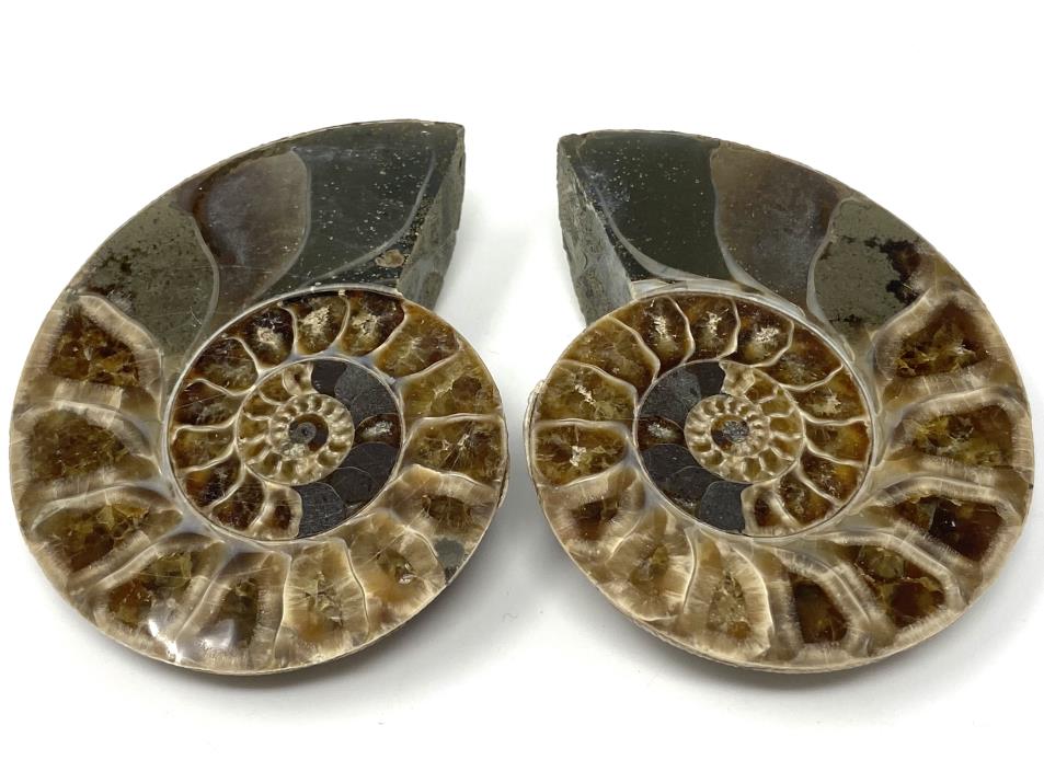 This fossil consists of an Ammonite cut and polished to create a striking pair. Both of the pieces display highly polished surfaces and a rough outer shell which displays some iridescent rainbow flashes. The fossil pattern reveals gorgeous, colourful internal calcite chambers.