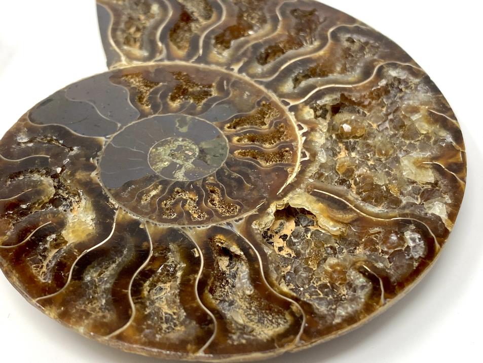 he fossil pattern reveals gorgeous, colourful internal calcite chambers lined by sparkling druzy crystals.