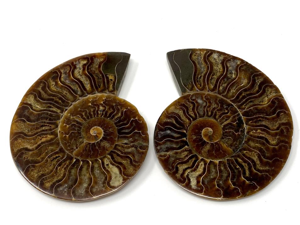 This particular Ammonite pair, of the Cleoniceras species, measures 10.2cm wide. These wonderful brown fossils display intricate swirling patterns and deep caramel, chocolate-brown, and cream tones upon their highly polished surfaces.