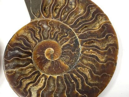 This fossil consists of an Ammonite cut and polished to create a striking pair. Both of the pieces display highly polished surfaces and a rough iridescent natural shell displaying shimmering rainbow colours. The fossil pattern reveals gorgeous, colourful internal calcite chambers.