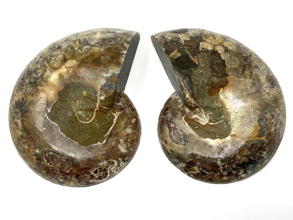 This fossil consists of an Ammonite cut and polished to create a striking pair. Both of the pieces display highly polished surfaces and a rough natural shell. The fossil pattern reveals gorgeous, colourful internal calcite chambers.