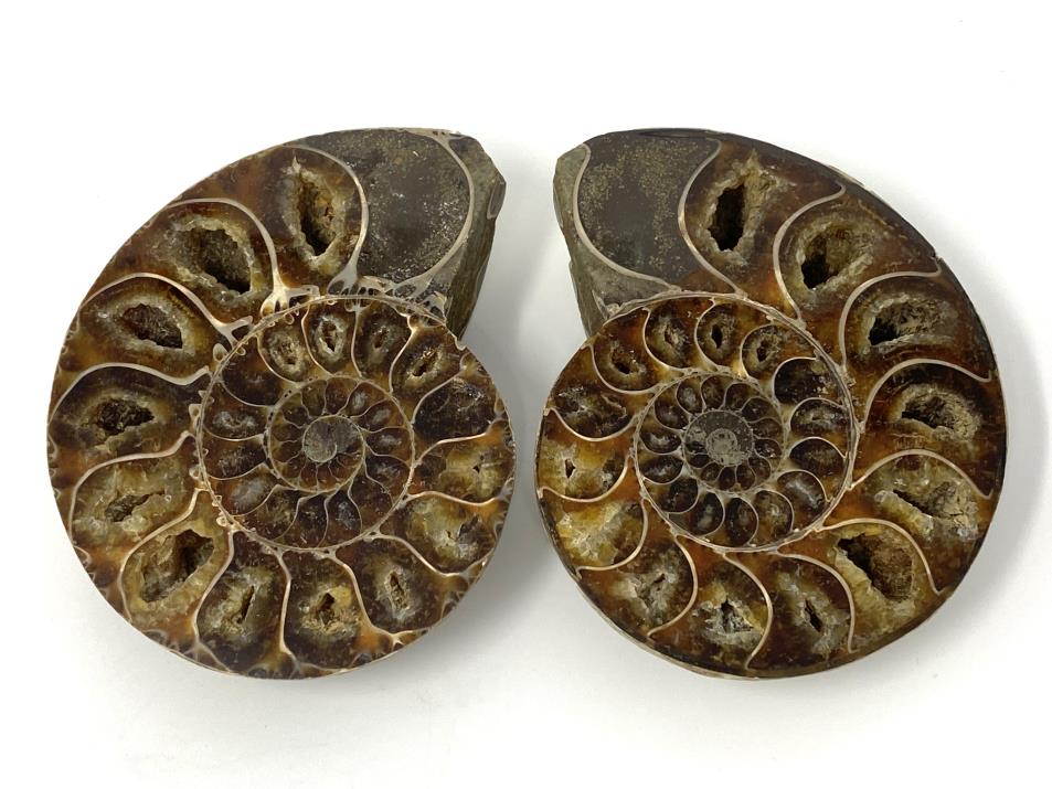 This particular Ammonite pair, of the Phylloceras species, measures 9.1cm wide. These wonderful brown fossils display intricate swirling patterns and deep caramel, chocolate-brown, and cream tones upon their highly polished surfaces.