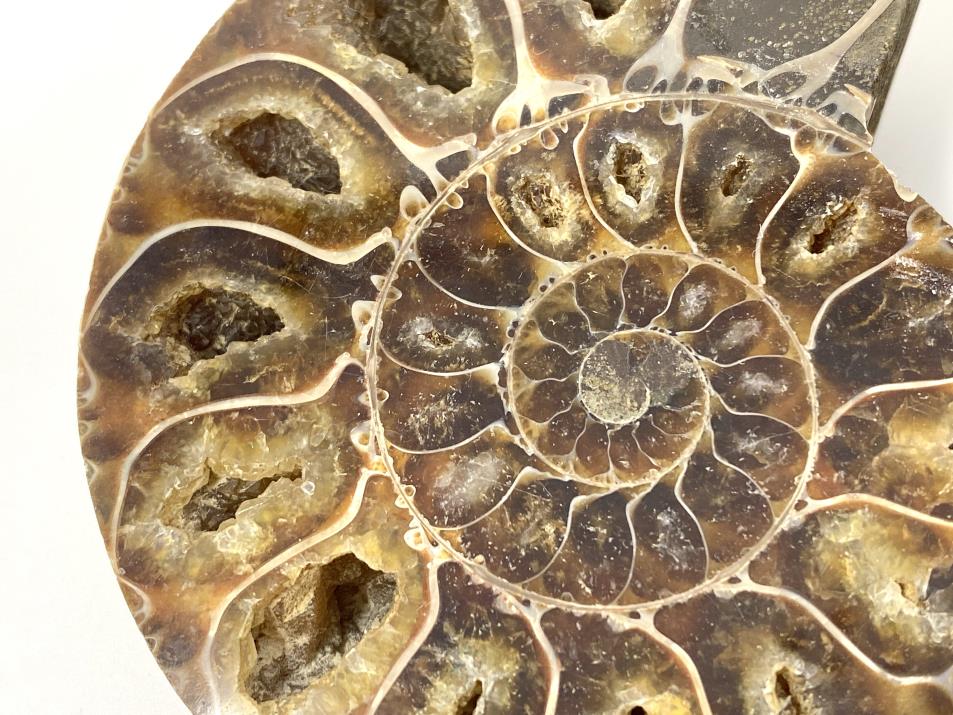 - Some minerals such as calcite seeped into the ammonite remains, leading to mineral replacements and ornately coloured interiors.