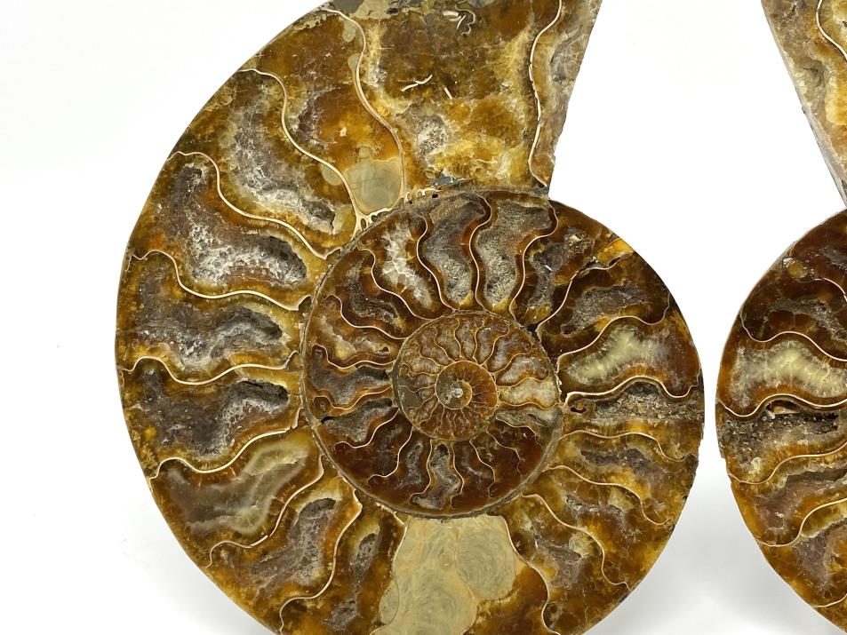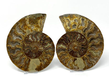 This particular Ammonite pair, of the Cleoniceras species, measures a magnificent 18.4cm wide. These wonderful brown fossils display intricate swirling patterns and deep caramel, chocolate-brown, and cream tones upon their highly polished surfaces.