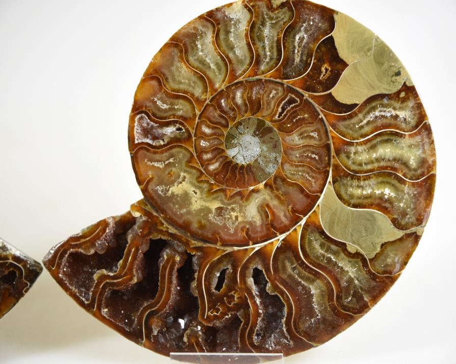 Ammonite Pair, fossil for sale from Madagascar. This large, detailed Ammonite Pair is 15cm at its widest measurement, and consists of an Ammonite cut and polished to create a striking pair. Both of the pieces display a rough natural surface on one side, and a highly polished surface on the other, which reveals deep caramel, yellow, and chocolate-brown tones and gorgeous cream-coloured internal calcite chambers.