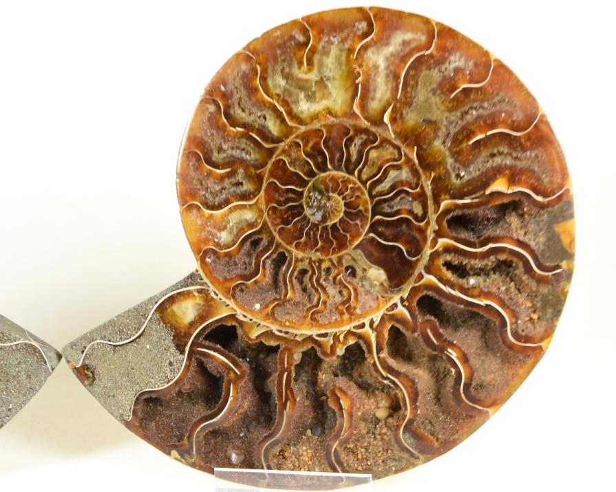 Ammonite Pair, fossil for sale from Madagascar. This stunning Ammonite Pair is 14cm at its widest measurement, and consists of an Ammonite cut and polished to create a striking pair. Both of the pieces display a rough natural surface on one side, and a highly polished surface on the other, which reveals deep caramel, yellow, and chocolate-brown tones and gorgeous cream-coloured internal calcite chambers.