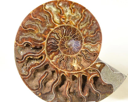 Displaying fascinating swirling patterns, this fossil's colours were caused by calcite minerals replacing the original organic material present in the Ammonite creature during its decay.