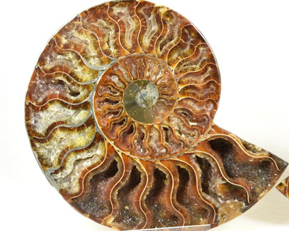 Ammonite Pair, fossil for sale from Madagascar. This large, detailed Ammonite Pair is 12.6cm at its widest measurement, and consists of an Ammonite cut and polished to create a striking pair. Both of the pieces display a rough natural surface on one side, and a highly polished surface on the other, which reveals deep caramel, yellow, and chocolate-brown tones and gorgeous cream-coloured internal calcite chambers.