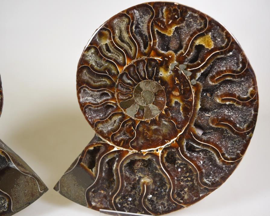 Ammonite Pair, fossil for sale from Madagascar. This large, gorgeous Ammonite Pair is 16cm at its widest measurement, and consists of an Ammonite cut and polished to create a striking pair. Both of the pieces display a rough natural surface on one side, and a highly polished surface on the other, which reveals deep caramel and yellow tones and gorgeous cream-coloured internal calcite chambers.