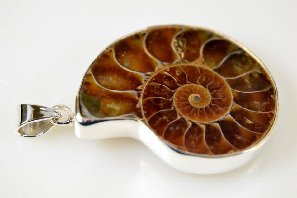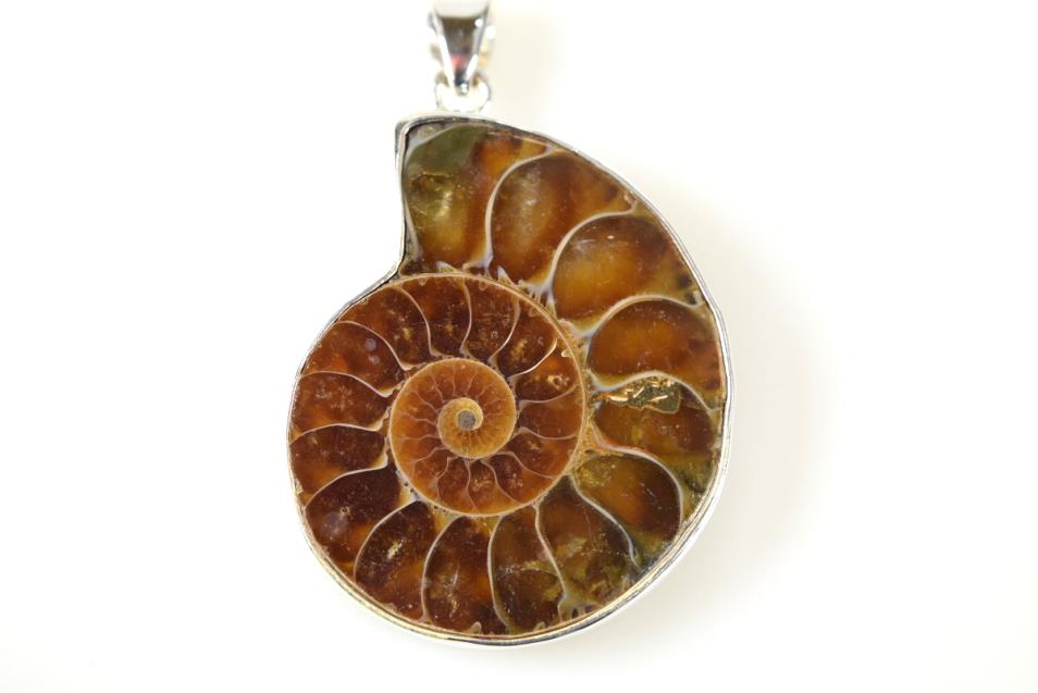 Ammonite half Pendant bevel set in 925 silver. This attractive 3.8cm tall cut and polished Ammonite Pendant is bevel set in 925 silver it is beautifully hand crafted using the highest grade Madagascan ammonites from the cretaceous period, 120 million years old found in Mahajanga. This pendant displays its richly coloured calcite chambers.