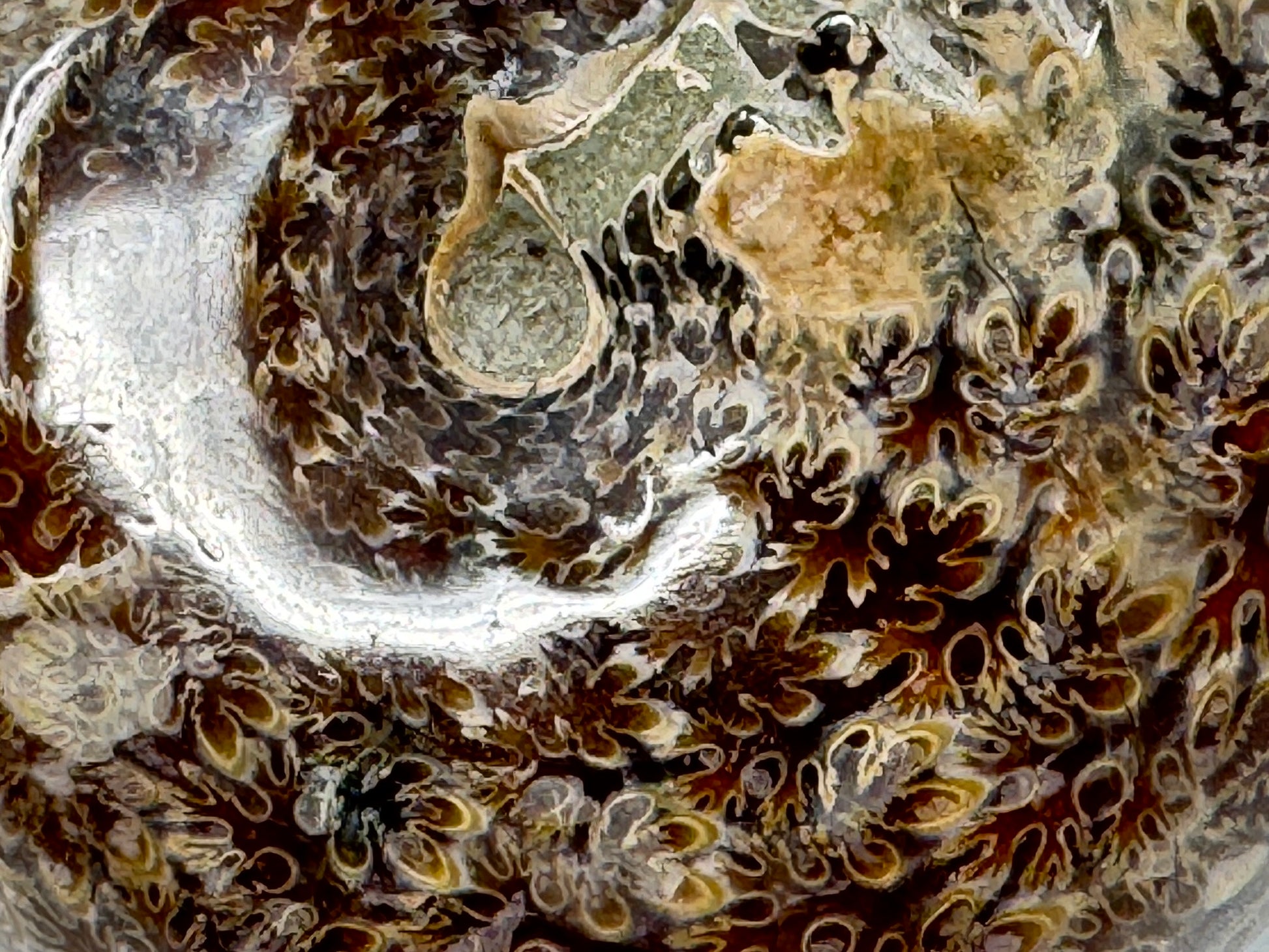 - Some minerals which seeped into the ammonite remains, such as colourful Calcite minerals, replaced the decomposed organic matter of the ammonite body over time, leading to the ornately patterned interiors and colourful chambers of Ammonite Fossils (via mineral replacements)