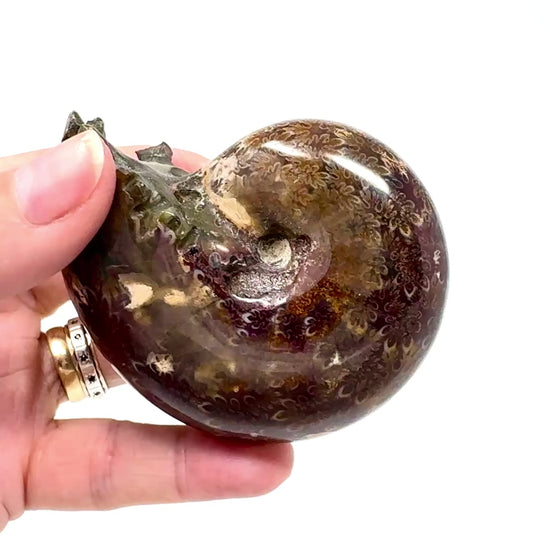 This stunning, high-grade Polished Ammonite Fossil from Madagascar, of the Phylloceras Ammonite Species, measures 7.7cm wide and has been carefully polished on top of its fossilised shell, which displays beautifully rich brown and grey colours and striking suture patterns and flashes of a Red iridescent shell.
