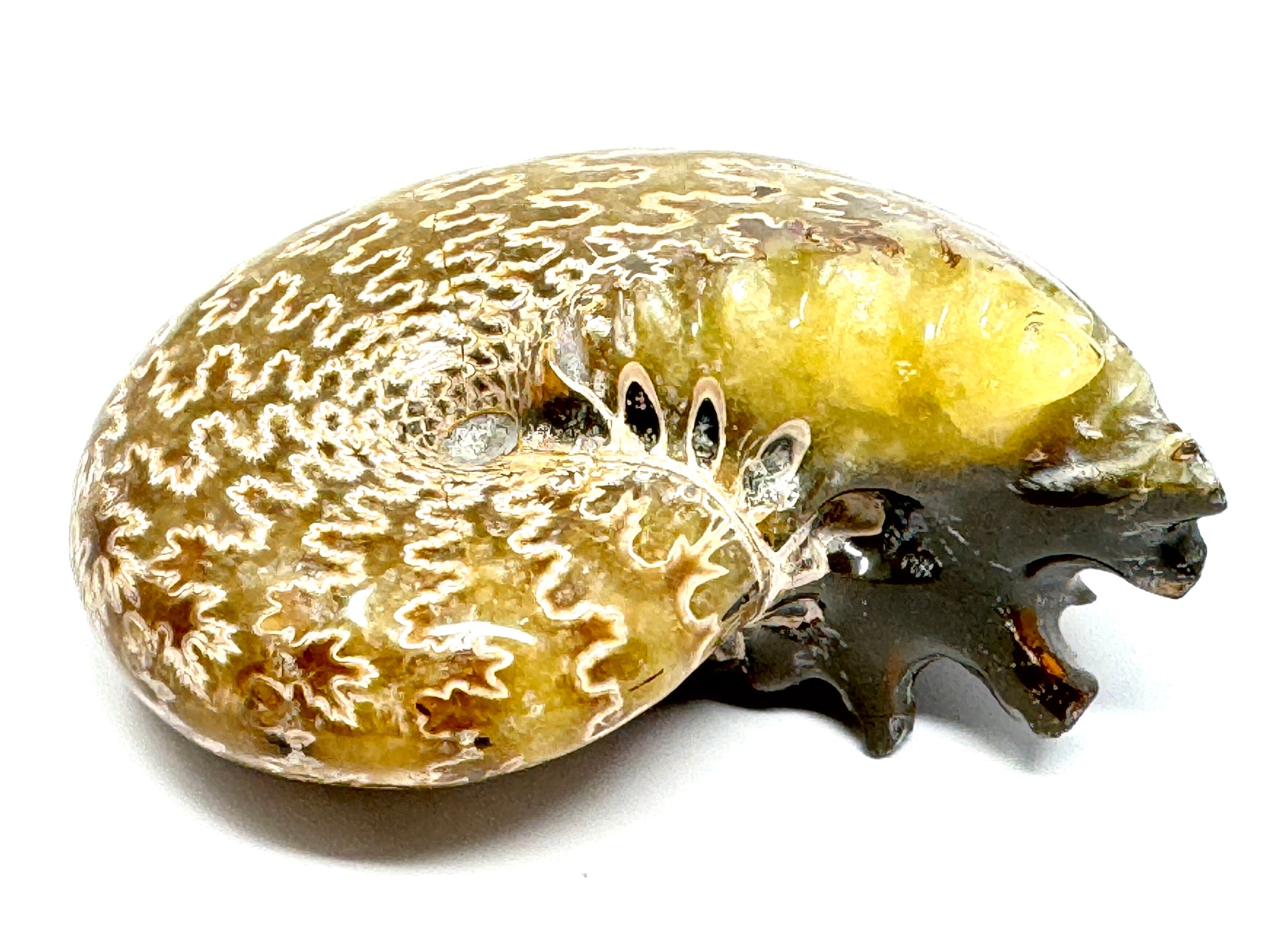 This beautiful tactile, high-grade Large Polished Ammonite Fossil from Madagascar, of the Phylloceras Ammonite Species, measures 9.2cm wide and has been carefully polished on top of its fossilised shell to reveal rich yellow coloured calcite and striking suture patterns.