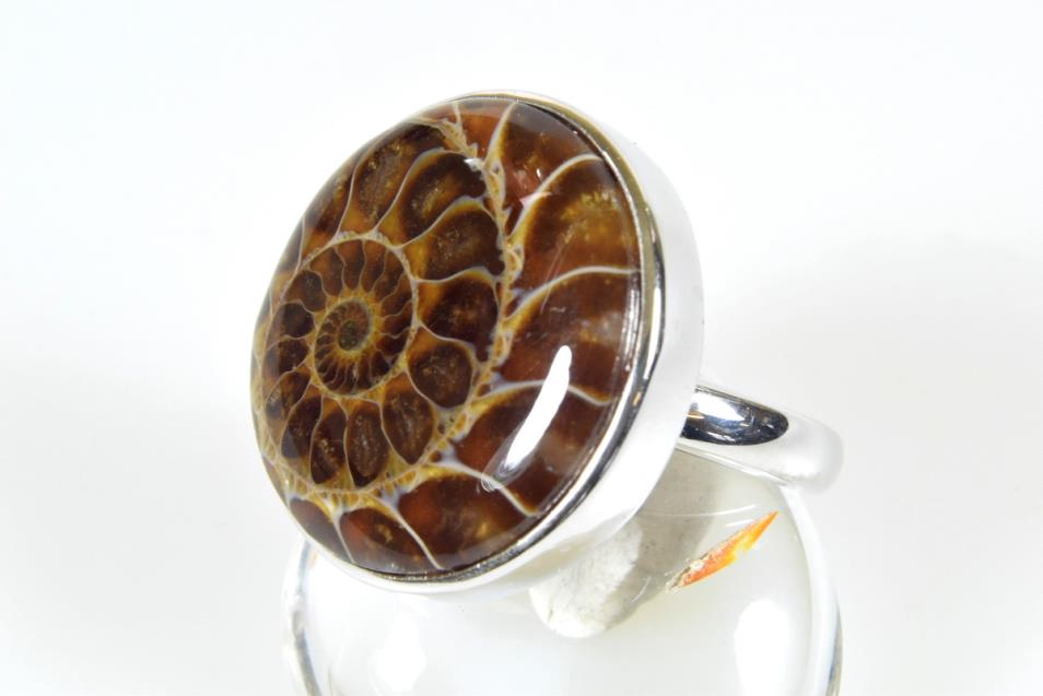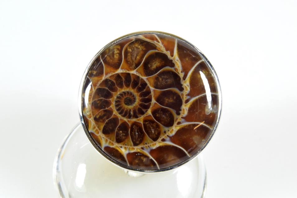 Hand Crafted Ammonite Ring. This lovely 23mm diameter cabochon Ammonite ring is bevel set in 925 Rhodium plated silver it is beautifully hand crafted using the highest grade Madagascan ammonites. The Ammonite is from the Cretaceous period 120 million years old. This ring displays deep rich Calcite colours. size; UK-Q US-8.