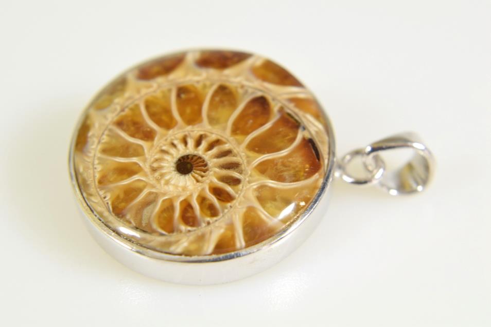 Ammonite round cabochon Pendant bevel set in 925 Rhodium Plated silver. This stunning 2.6cm diameter cut and polished Ammonite Pendant is bevel set in 925 Rhodium plated silver it is beautifully hand crafted using the highest grade Madagascan ammonites from the cretaceous period, 120 million years old found in Mahajanga. This pendant displays the ammonites richly coloured calcite chambers and the silver is Rhodium plated which helps to prevent tarnishing.