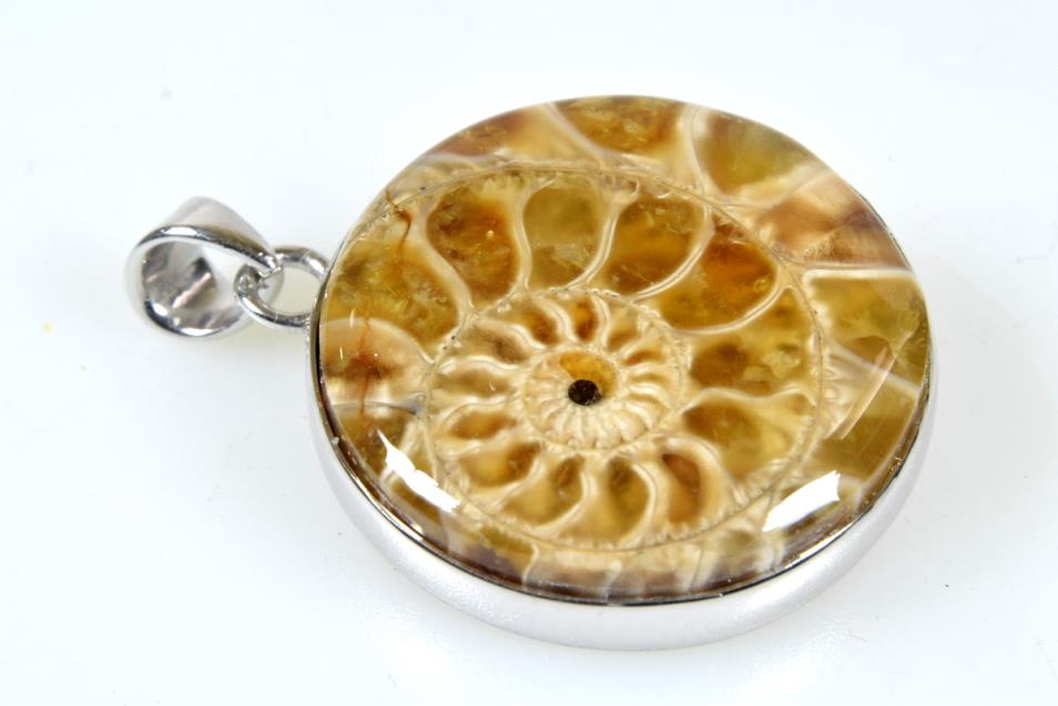 Ammonite round cabochon Pendant bevel set in 925 Rhodium Plated silver. This gorgeous 2.5cm diameter cut and polished Ammonite Pendant is bevel set in 925 Rhodium plated silver it is beautifully hand crafted using the highest grade Madagascan ammonites from the cretaceous period, 120 million years old found in Mahajanga. This pendant displays the ammonites richly coloured calcite chambers and the silver is Rhodium plated to prevent tarnishing.