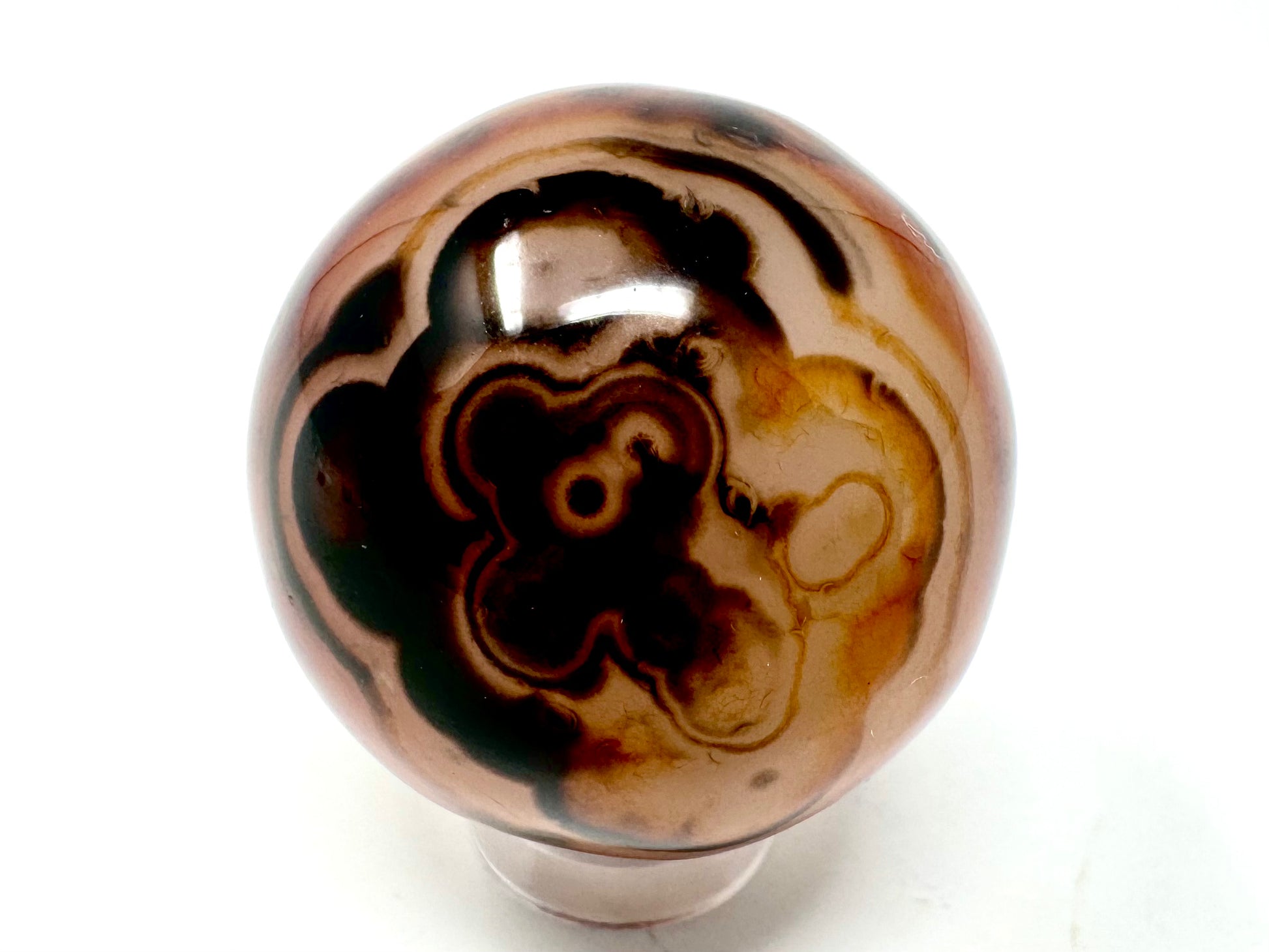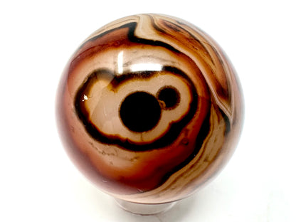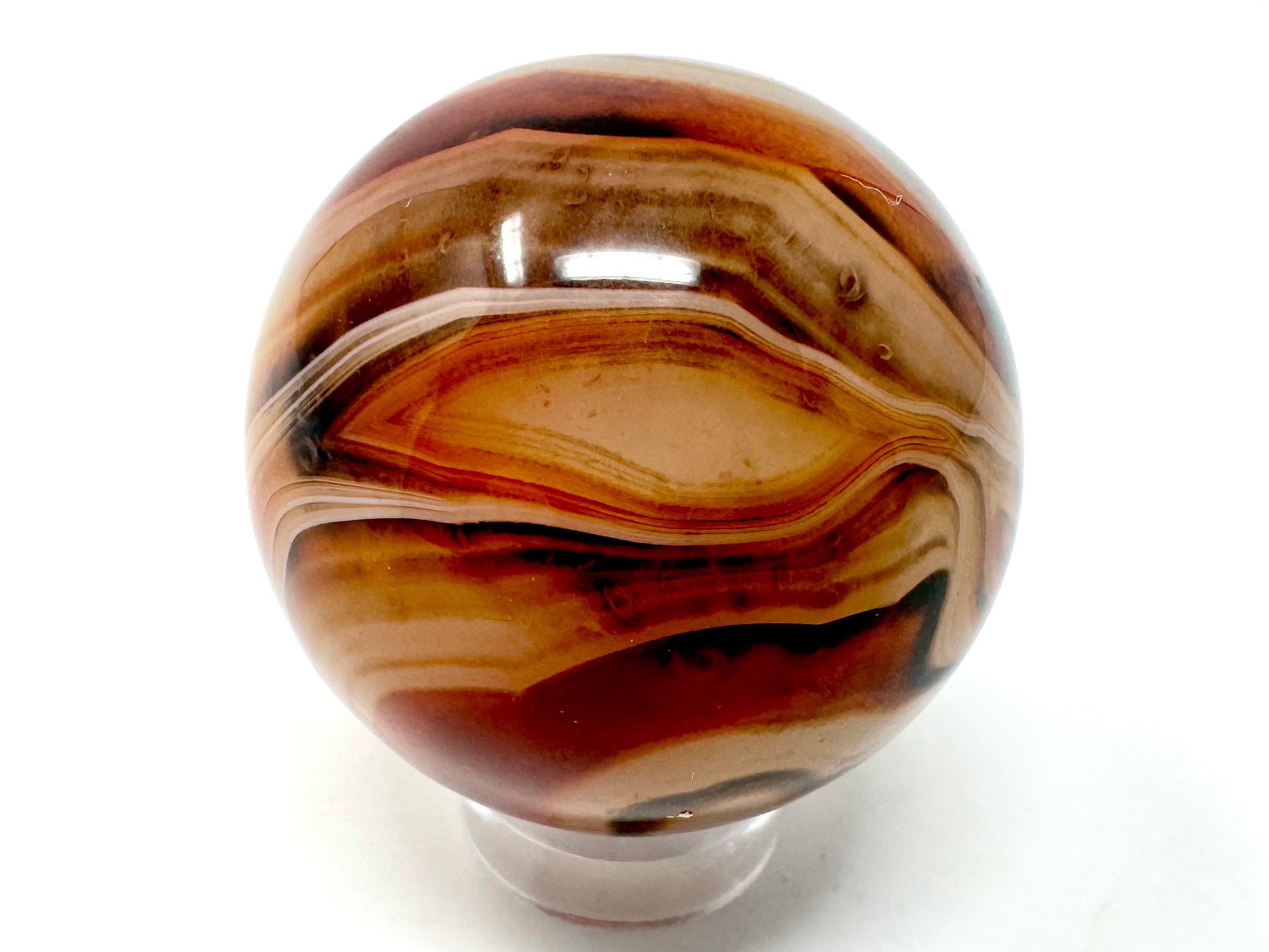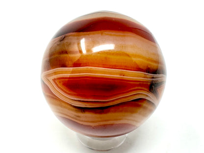 This dainty, gorgeous Banded Agate Crystal Sphere measures 3.2cm in diameter and displays stunning bands of red, orange, white, black, and grey, with patterns similar to Sardonyx and Carnelian.