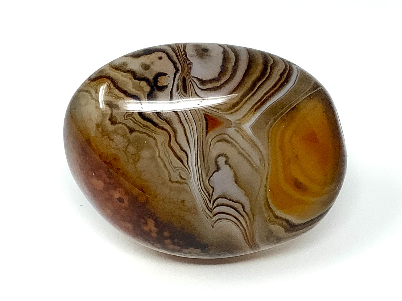This dainty, gorgeous Banded Agate Pebble or Banded Agate Palm Stone measures 5cm long and displays stunning bands of red, orange, white, black, and grey, with patterns similar to Sardonyx and Carnelian.