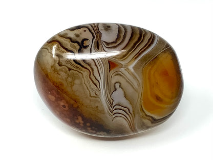 The Banded Agate Stone has been carefully cut and polished into a tactile crystal palm stone shape or crystal pebble shape, creating a striking Banded Agate Crystal Palm Stone.