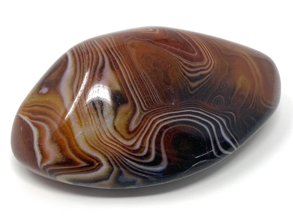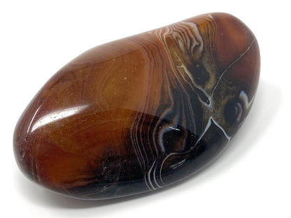 This gorgeous Large Banded Agate Crystal Pebble (also known as a Large Banded Agate Crystal Palm Stone) measures 9.8cm long and displays stunning bands of black, orange, red, and white, with patterns similar to Sardonyx and Carnelian.