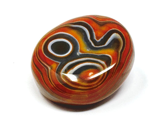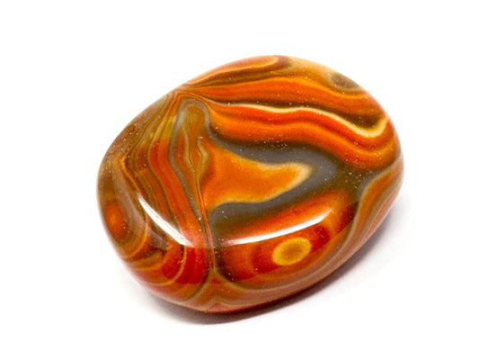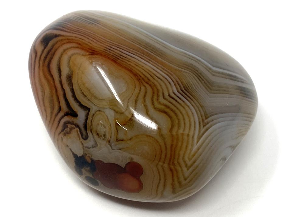 This gorgeous Banded Agate Crystal Pebble (also known as a Banded Agate Crystal Palm Stone) measures 5.1cm long and displays stunning bands of orange, red, brown, grey, and black, with patterns similar to Sardonyx and Carnelian.