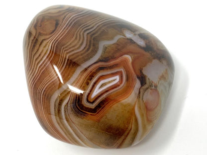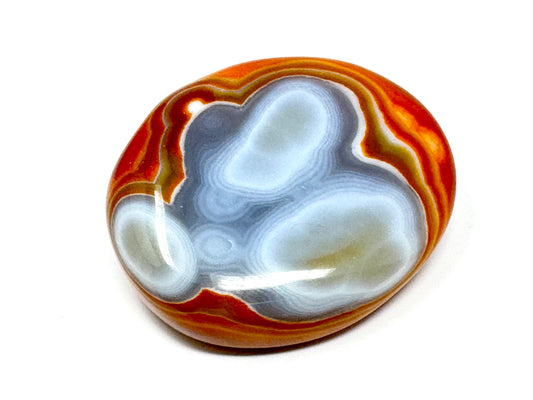 The Banded Agate Stone has been carefully cut and polished into a tactile crystal pebble shape or crystal palm stone shape, creating a striking and tactile Banded Agate Pebble or Banded Agate Palm Stone.