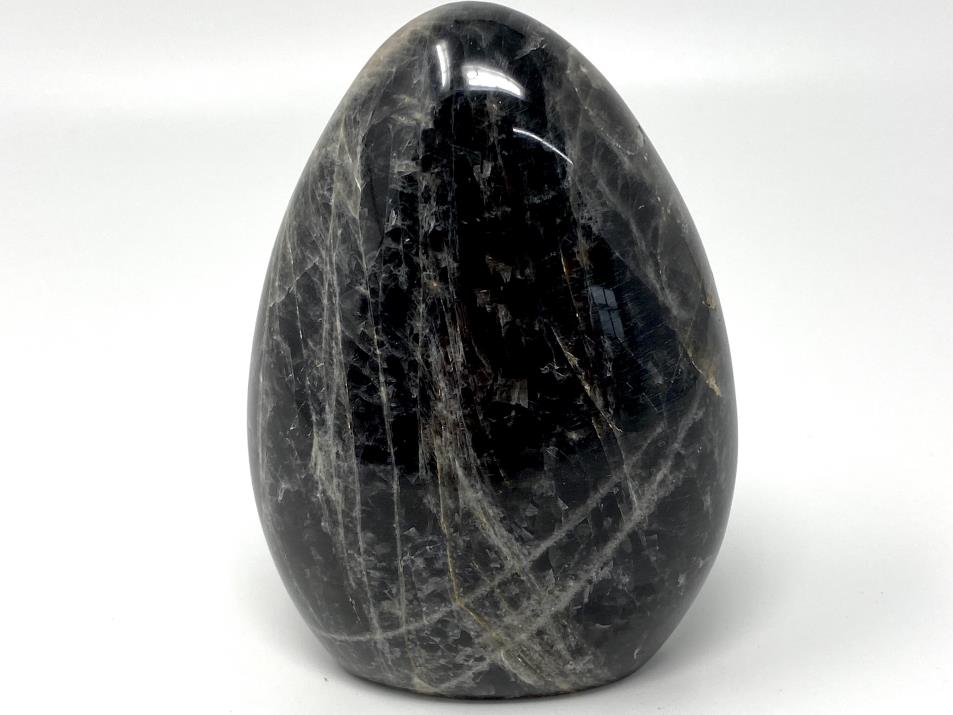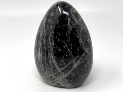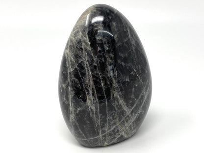 This stunning, large Black Moonstone Freeform measures 11.7cm tall and displays striking black hues adorned with silvery-white shimmer and flash.