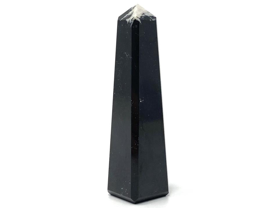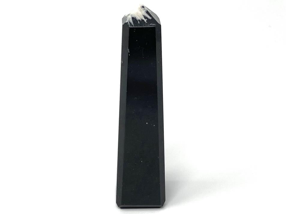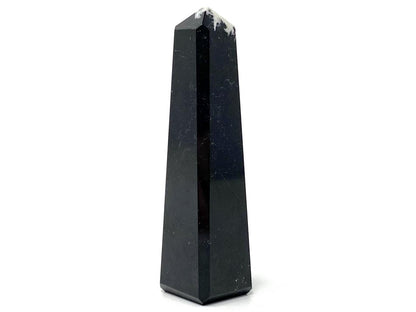 The Natural Black Tourmaline Stone has been carefully cut into a smooth black crystal tower shape (black crystal obelisk shape) and hand-polished to create a Polished Black Tourmaline Tower Crystal (Polished Black Tourmaline Obelisk Crystal) with a free-standing square base, four polished faces, and sharp pointed tip.