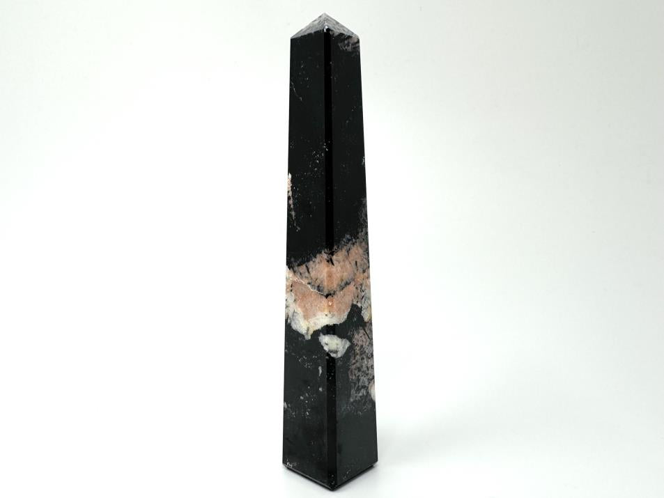 The Natural Black Tourmaline Stone has been carefully cut into a smooth black crystal tower shape (black crystal obelisk shape) and hand-polished to create a Polished Black Tourmaline Tower Crystal (Polished Black Tourmaline Obelisk Crystal) with a free-standing square base, four polished faces, and sharp pointed tip.