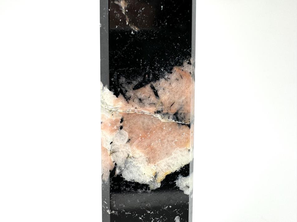 Displaying lustrous inky black tones with striking pink-orange, peach-coloured, and white Feldspar inclusions, this piece is smooth to the touch, and also displays some small natural pits on its polished surface.