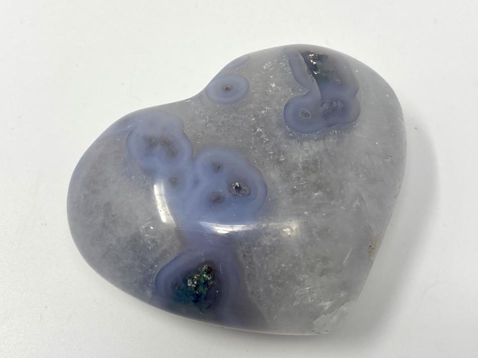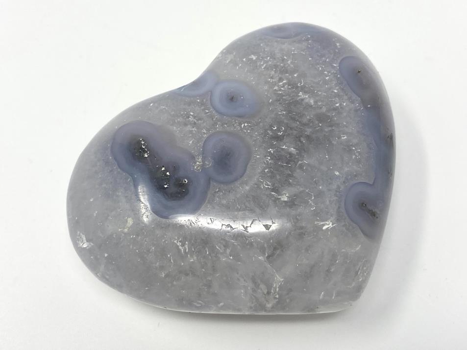 This beautiful Quartz Agate Crystal Heart measuring 7cm wide displays a stunning Quartz base adorned with beautiful circles and tube-like banded patterns of translucent Blue-Grey Chalcedony Agate.