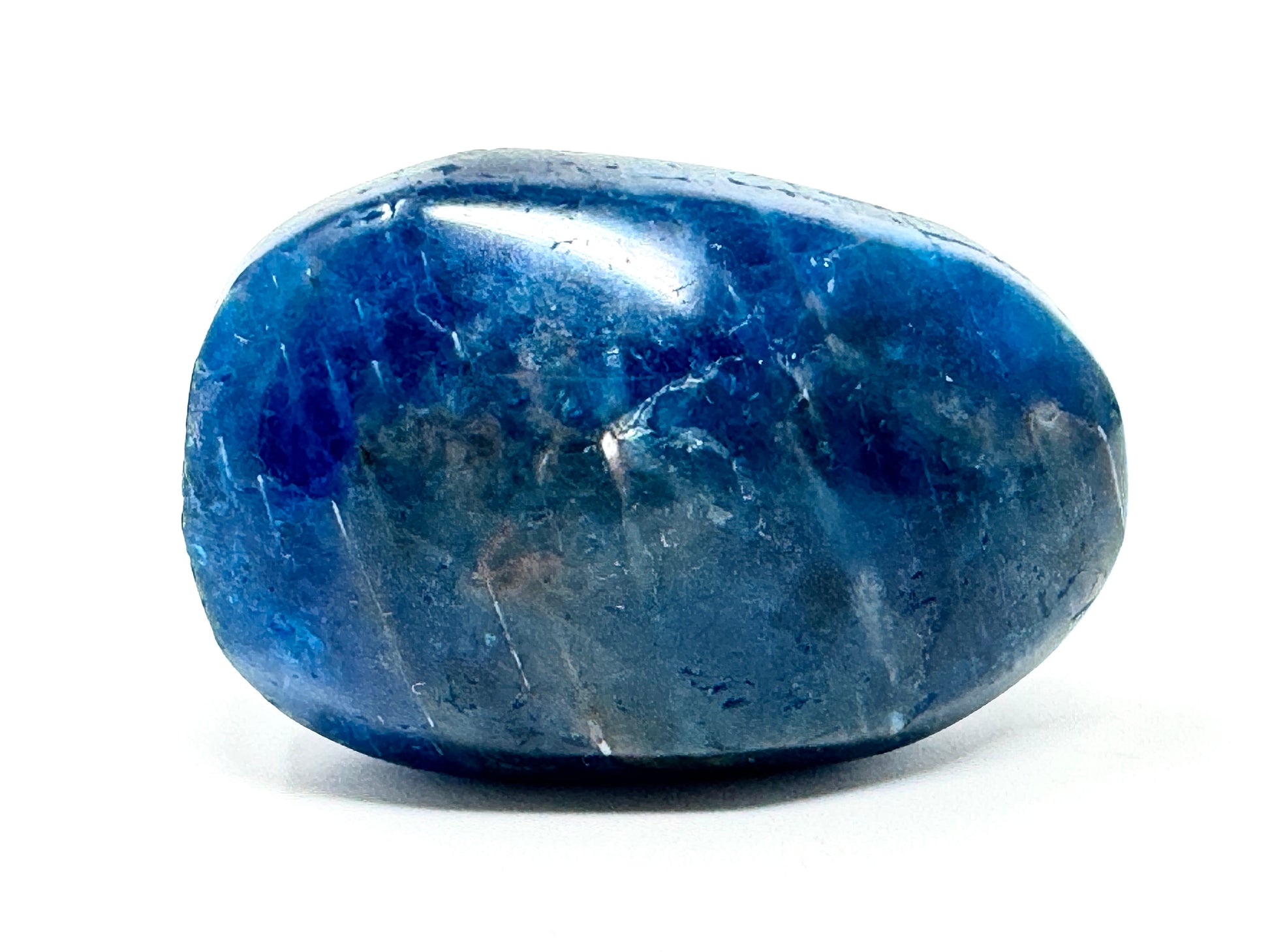 This Blue Apatite Crystal has been carefully cut and polished into a tactile, smooth oval crystal pebble shape or crystal palm stone shape, and its gorgeous blue colouring contrasts beautiful against the blue shades of other blue crystals and gemstones.